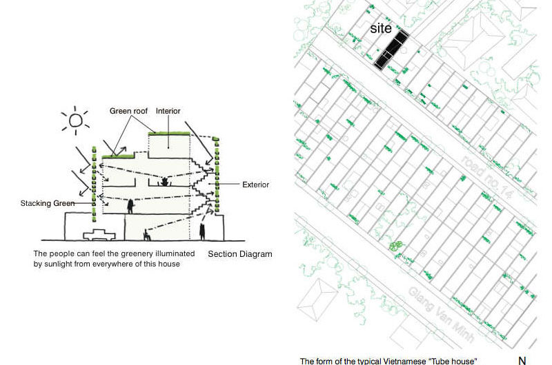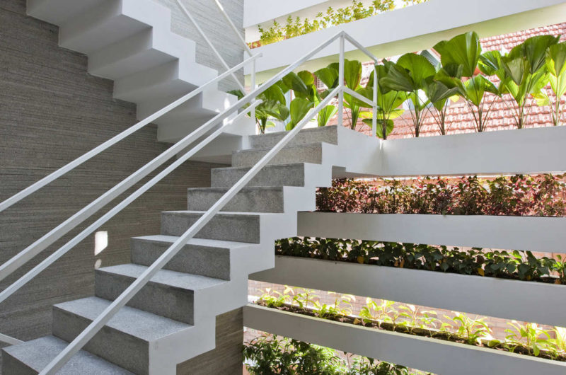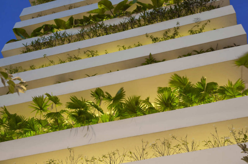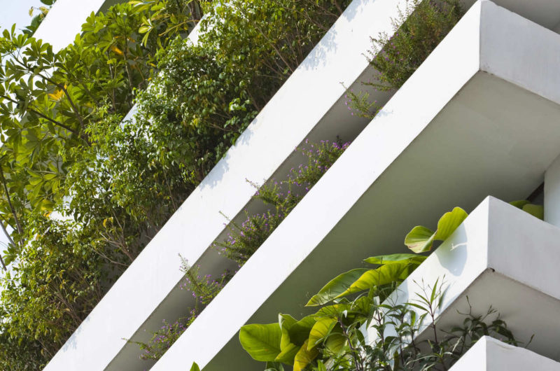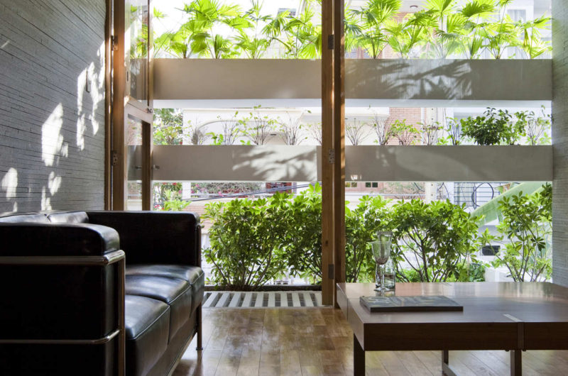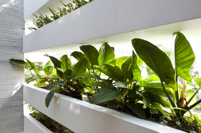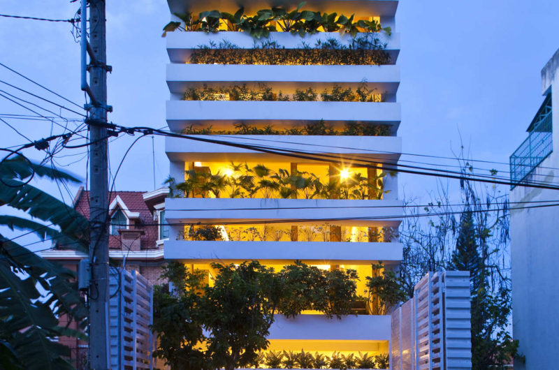 Saigon, a beautiful Vietnamese city filled with flower pots, inspired Vo Trong Nghia Studio to create the Stacking Green project. This is a four-story residence designed for a thirty-years-old couple and their mother. It is a tube house with the front and back facades made of layers of concrete planters, adjusted at different heights depending on what type of plants they hold. The greenery is automatically irrigated through the pipes inside the planters.
