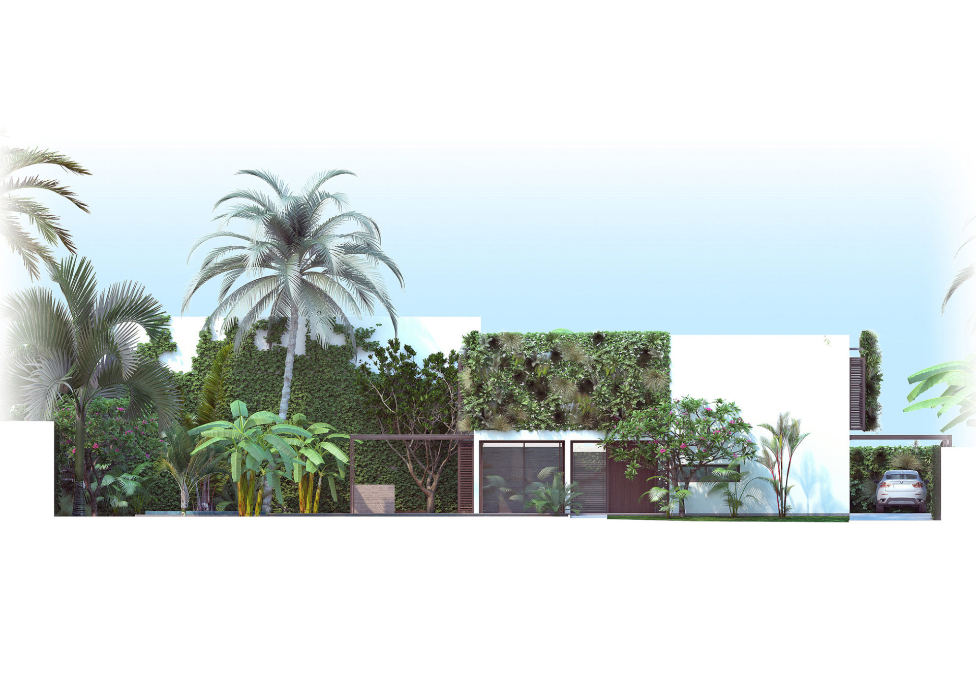 The building has been reduced to his most minimal expression, a white cubic shape with two vertical vegetal walls added on the front and back of the house in order to bring privacy for the bedrooms and allowing large openings for natural ventilation without crossing views. The vertical garden “extends” the surrounding vegetation onto the walls and makes the house “disappearing” into the landscape. It creates a strong visual connection between the house and the garden and gives an identity to the place.