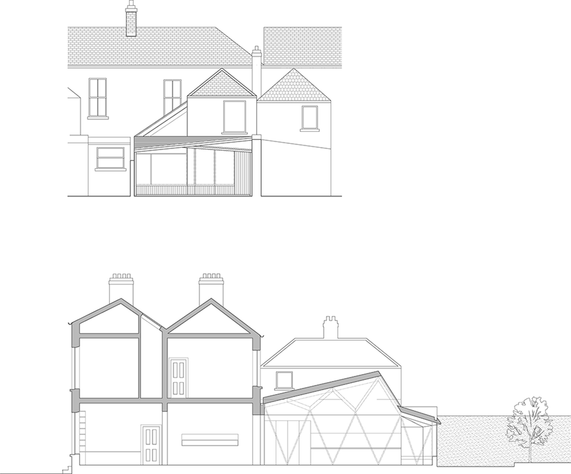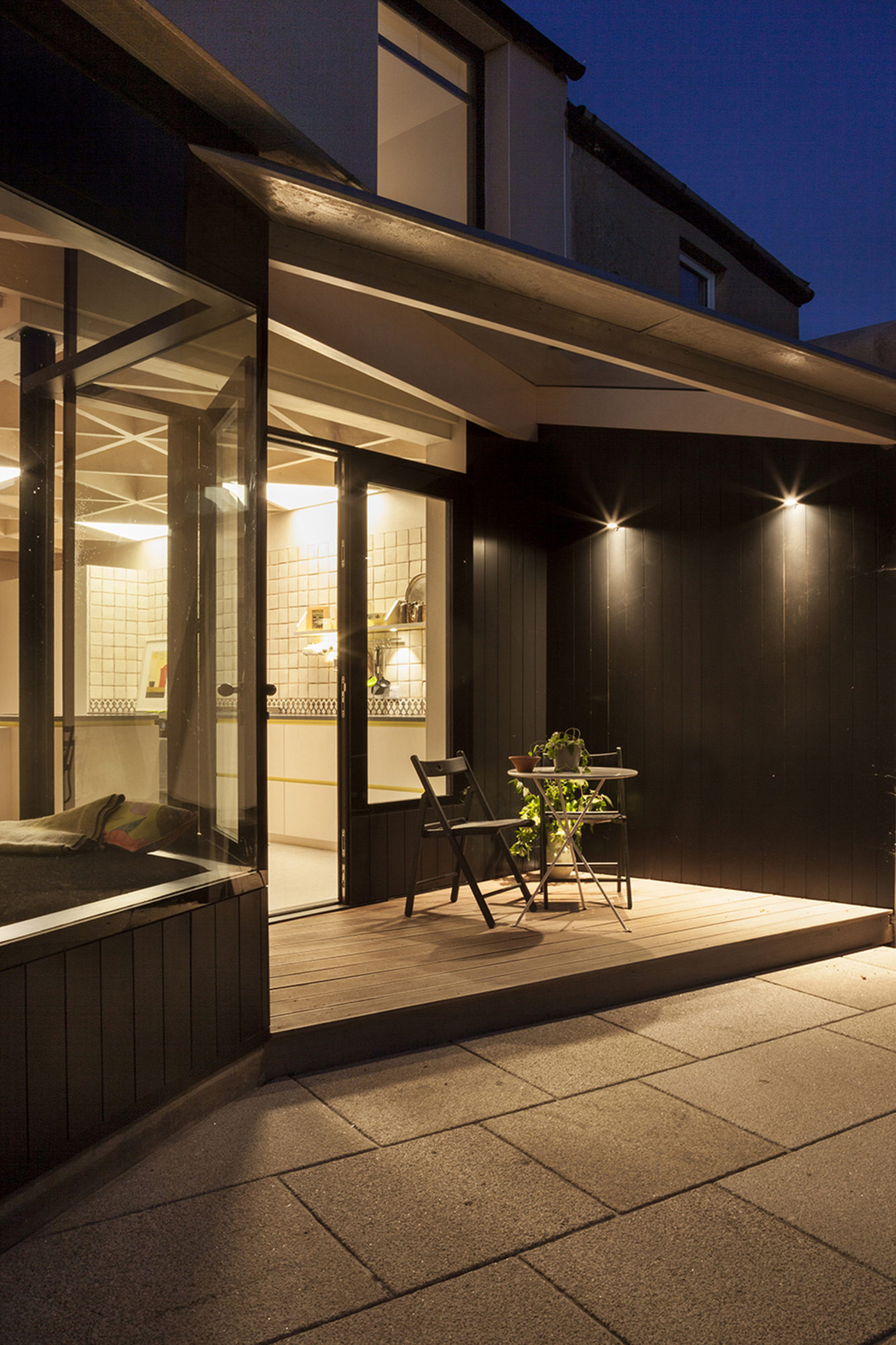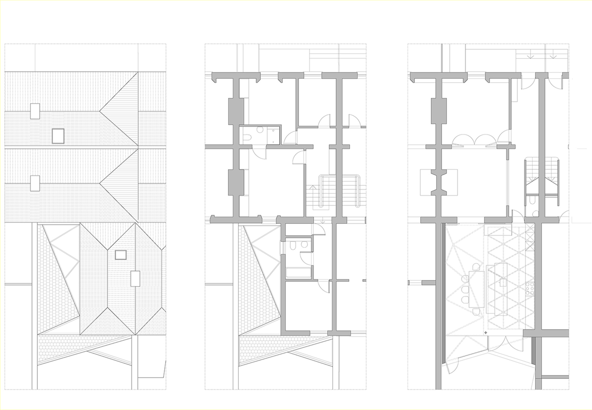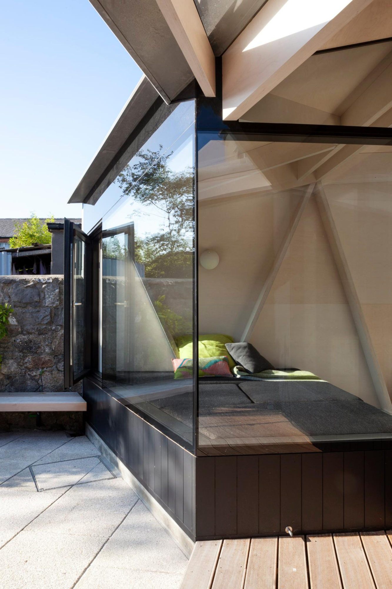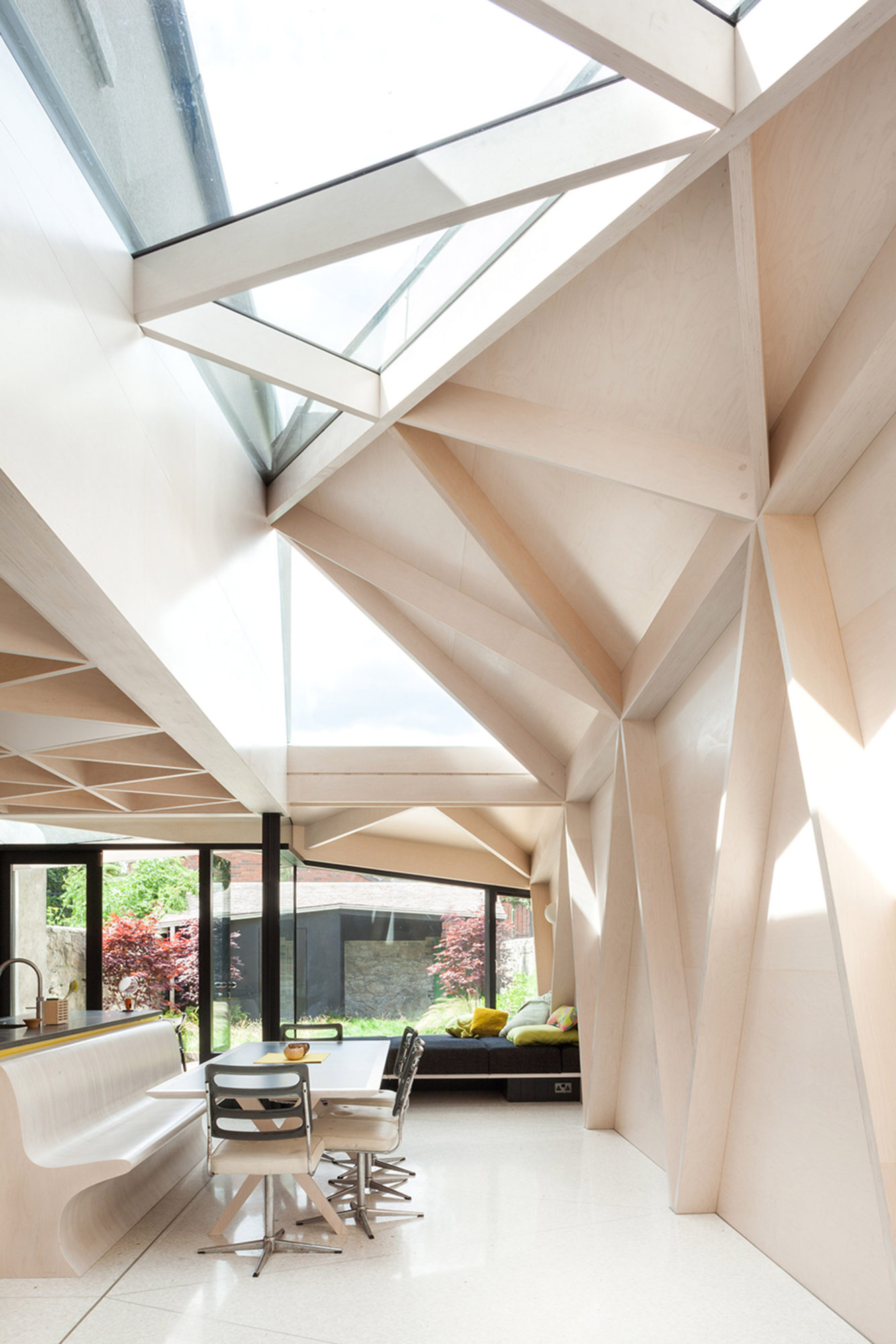 The form of the new build plywood structure is a series of interconnecting triangular plains. These plains are positioned to allow light deep into the plan as the sun moves across the house during the day. The plains are supported on a prefabricated plywood lattice structure supported off a glulam beam.