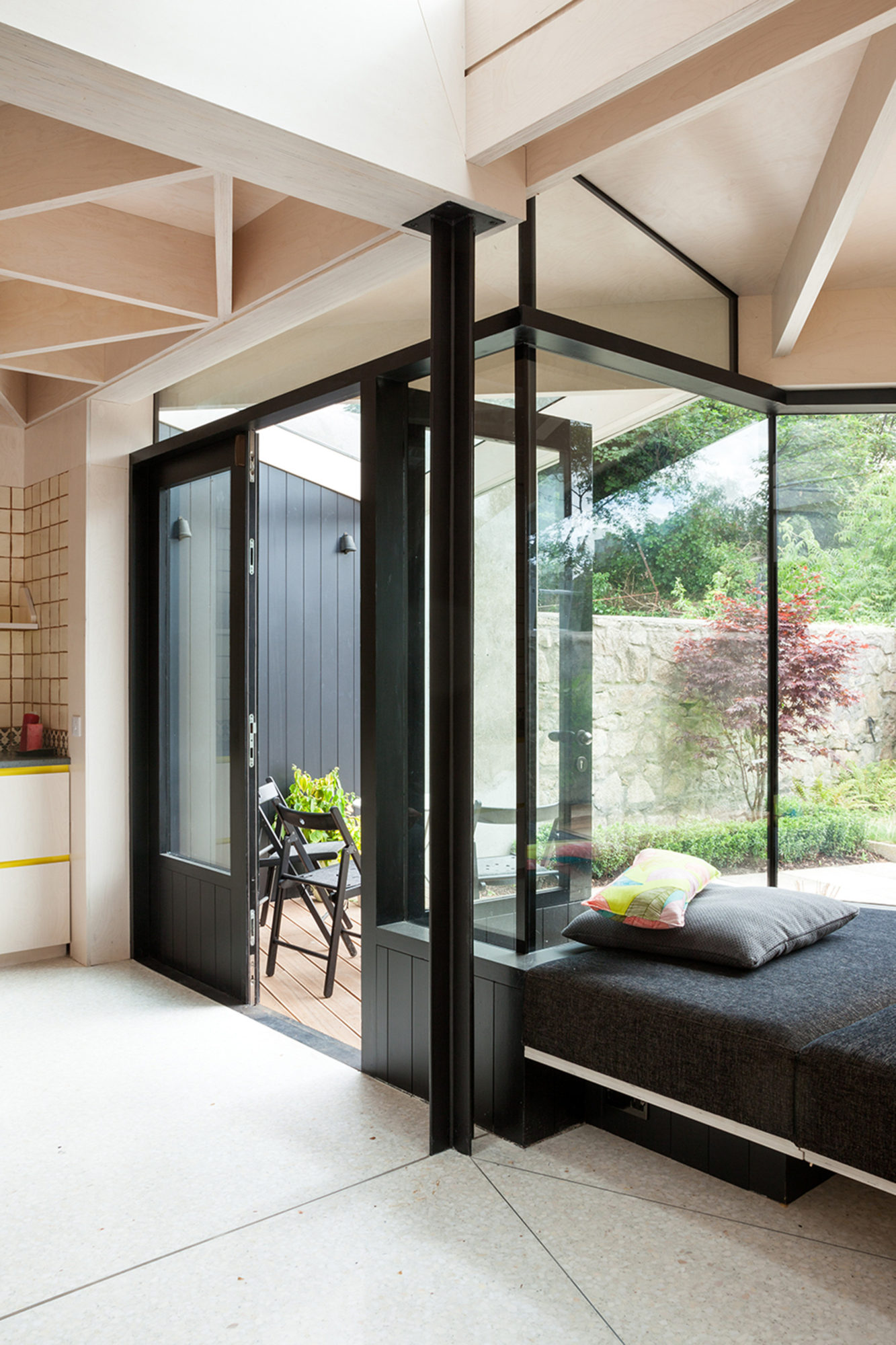 The first floor is supported by a series of plywood glulam beams, which are backed in turn by a cruciform steel column. The idea to use plywood for the new structure makes sense, as the material boasts certain aesthetic advantages, not to mention its economic properties. Glass was also used extensively for the windows, sliding doors and skylights, all of which allow natural light to flow throughout the living areas without obstruction.