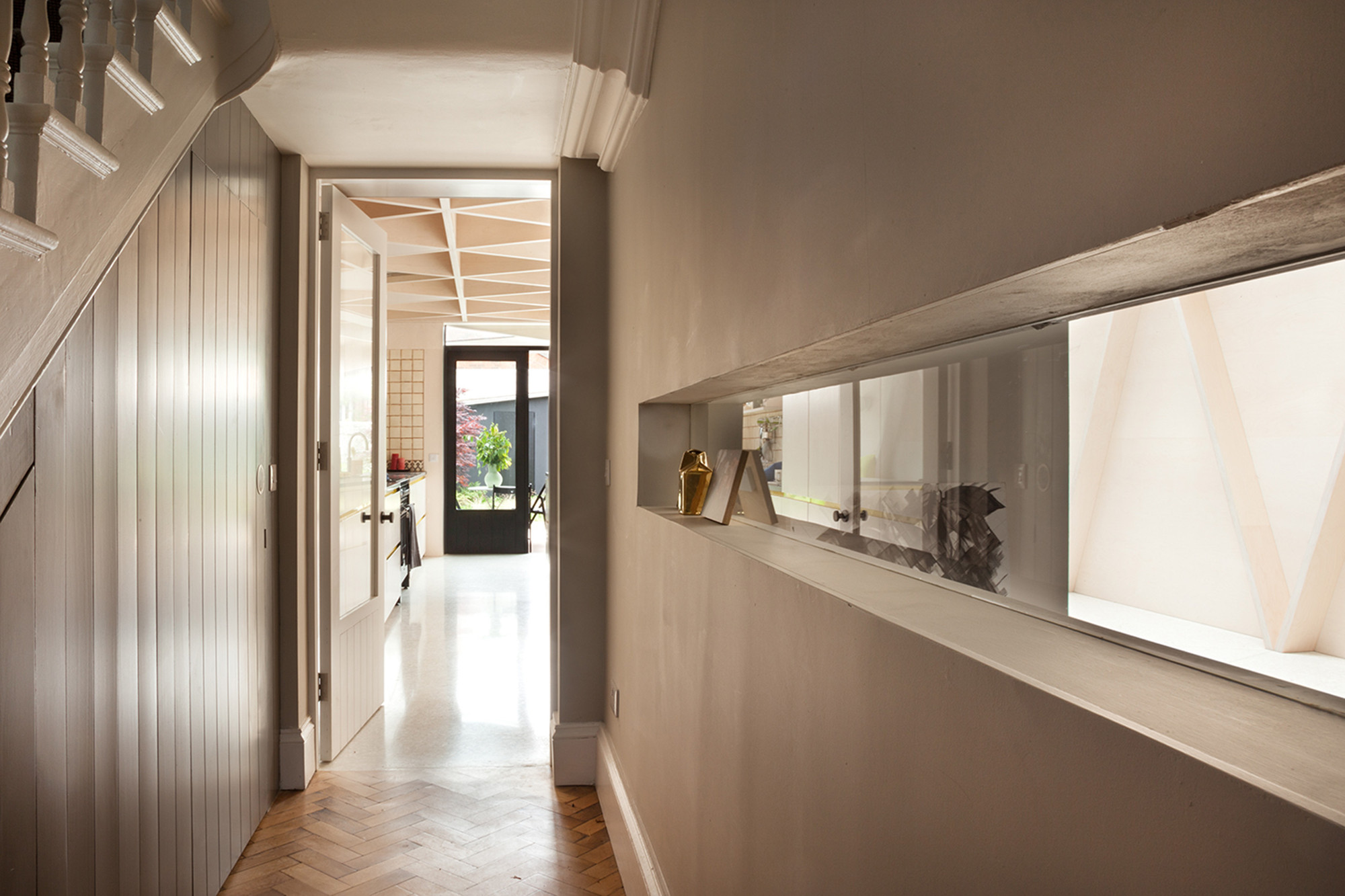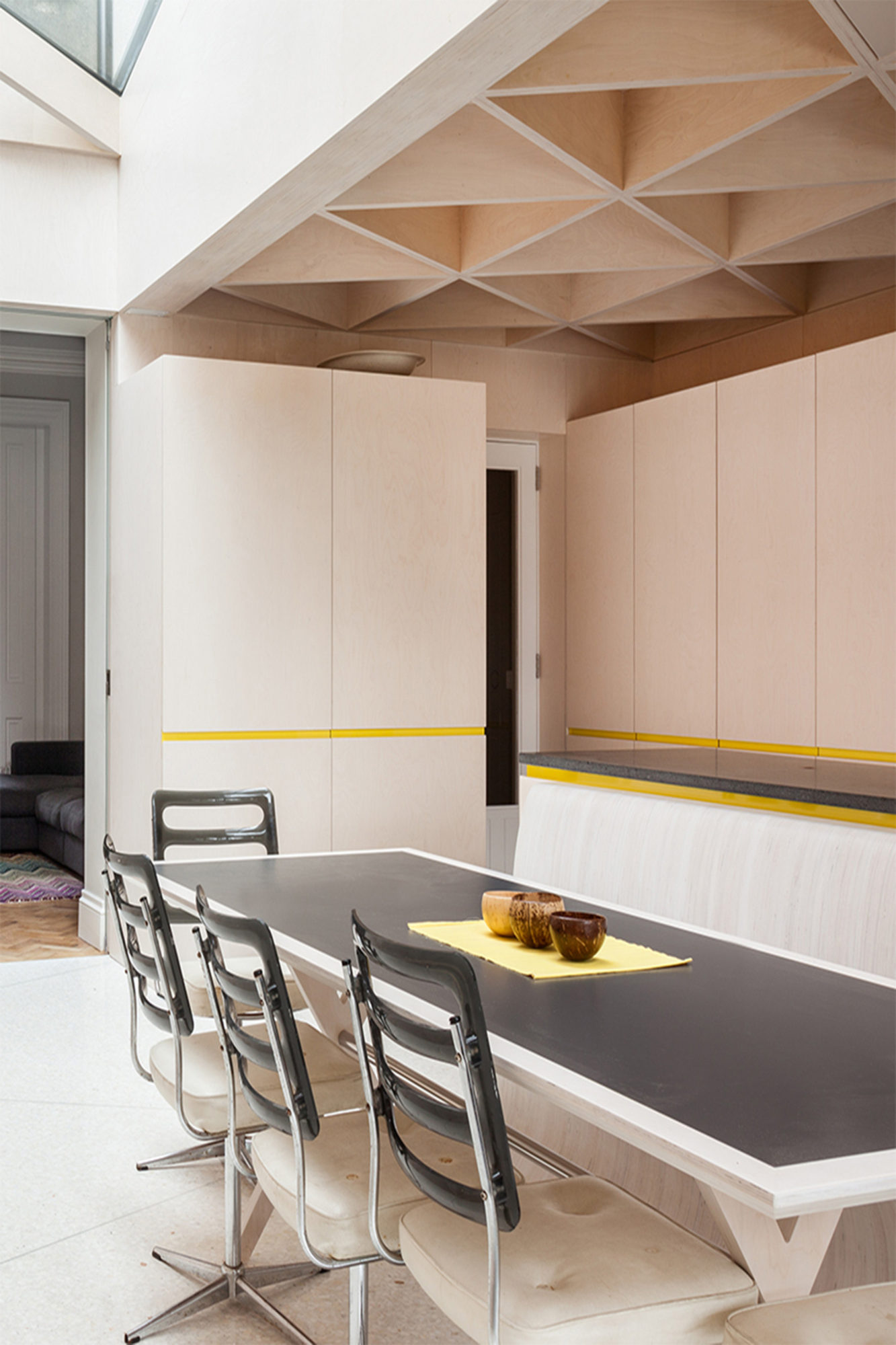 2.The glulam beam frames the ceiling over the kitchen, the ceiling is made up of a prefabricated triangular plywood module laminated in situ creating a diagrid structure and braced by a skin of plywood, acting as the floor for the first floor.