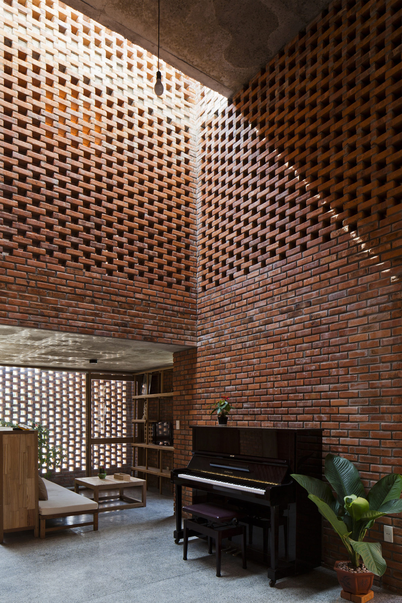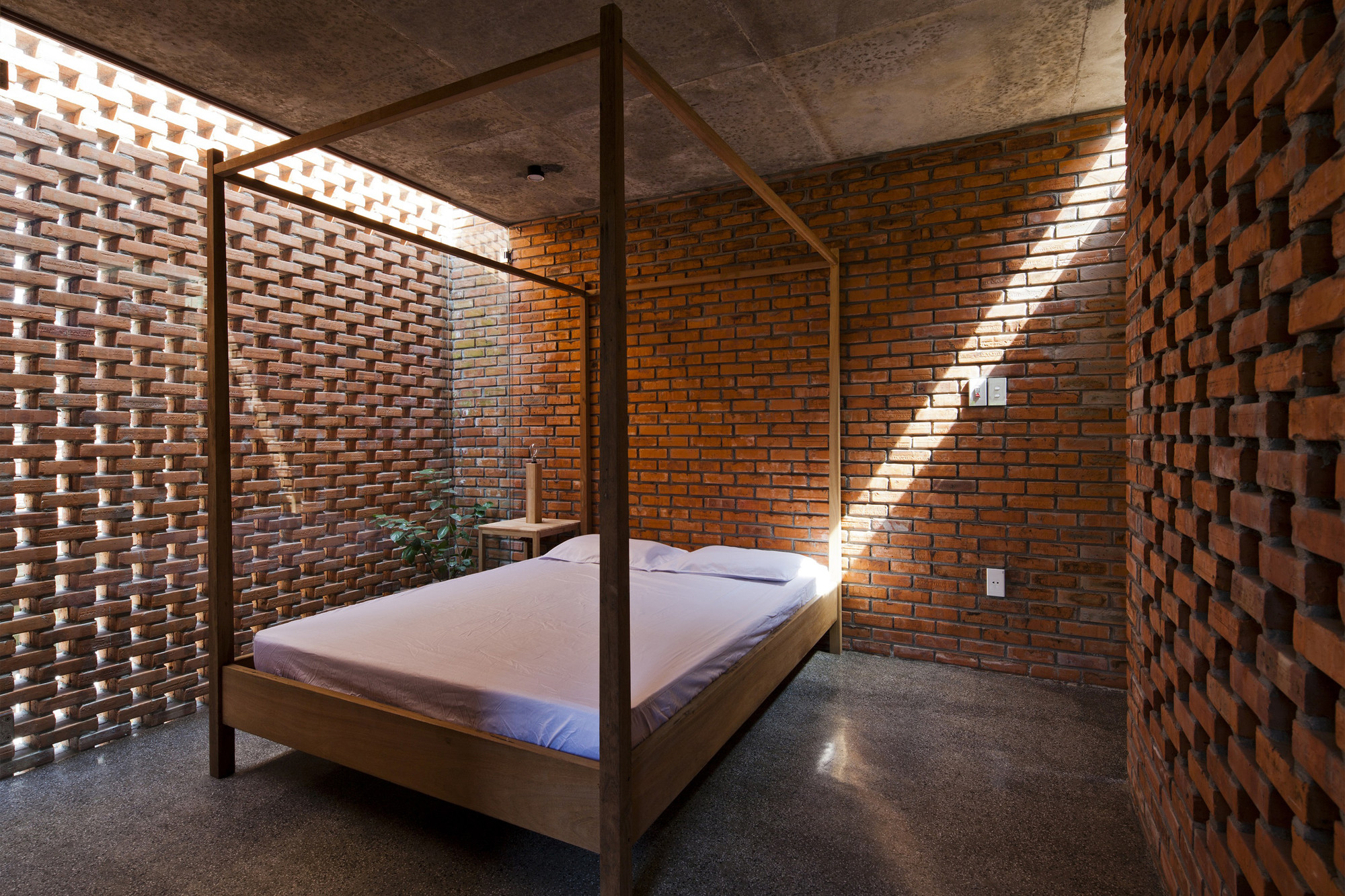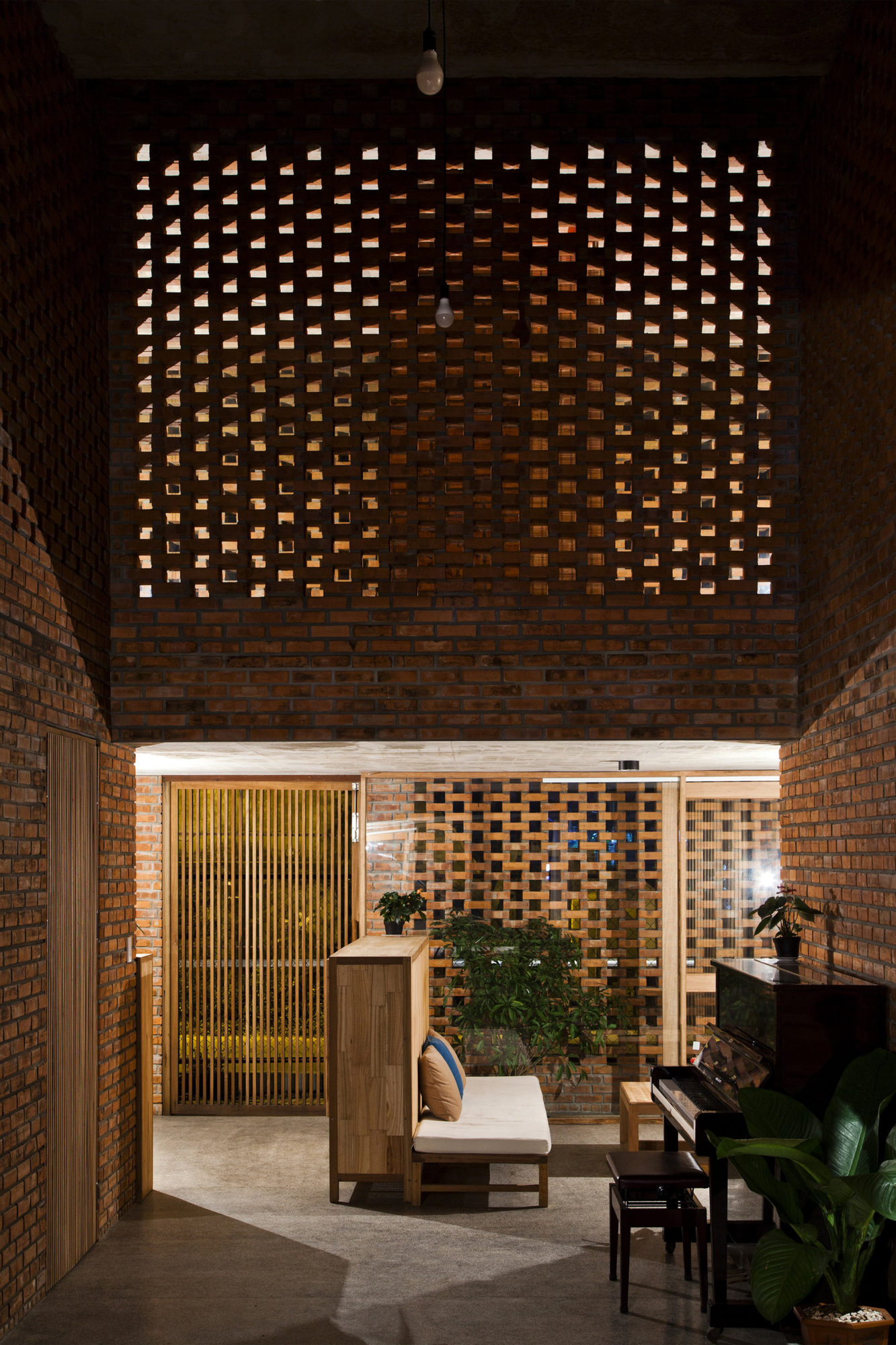 At different times during the day, the variety of the light intensity getting through the inter-floor holes makes the brick wall colors change from the light red in the morning, red at noon, dark red in the afternoon and more purple in the late afternoon and early evening. In the evening and at night, the house looks like a giant lantern with lights here and there from the holes. The surrounding brick walls are decorated with some rough bricks to make shadows. This improve the beauty and charm of every single samel-brick regarding its own shape and color.