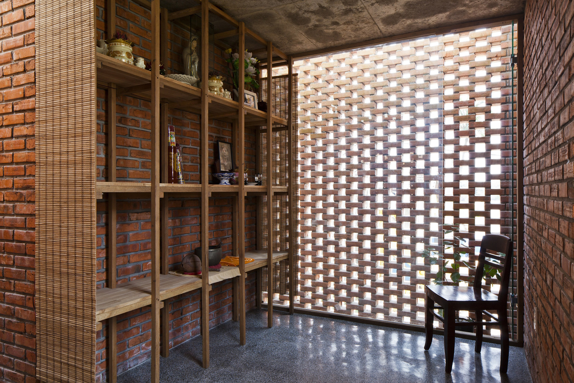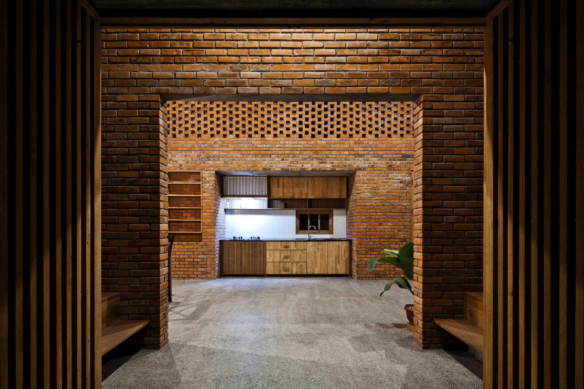 The special design of the baked-brick walls with a lot of holes, together with the large inter-floor space, allows breeze and light to get to all the corners of the house, even the hardest-to-access areas. The house owners are also able to enjoy the blue sky during the daytime or the moonlight night-time from the living room, the dining table or the kitchen.