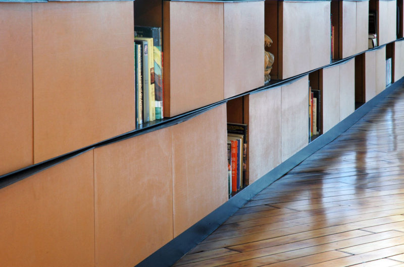 Then, the stake was on the casework and detailing because while his casework was designed as stacked volumes which can be modified from closed cabinets to open shelves, her casework is more abstract with glass doors and a more monolithic expression.