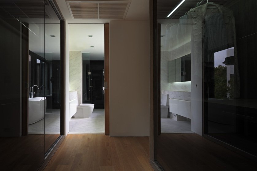It’s an L-shaped house just because they wanted to increase the usable space and the green area. The north side of the house is covered with glass in order to receive natural sunlight because the northern sunlight is the least intense in Thailand.