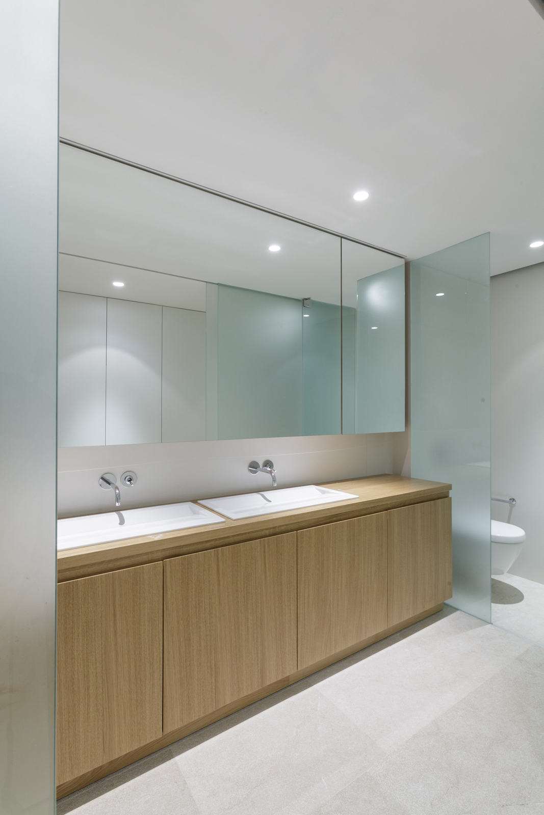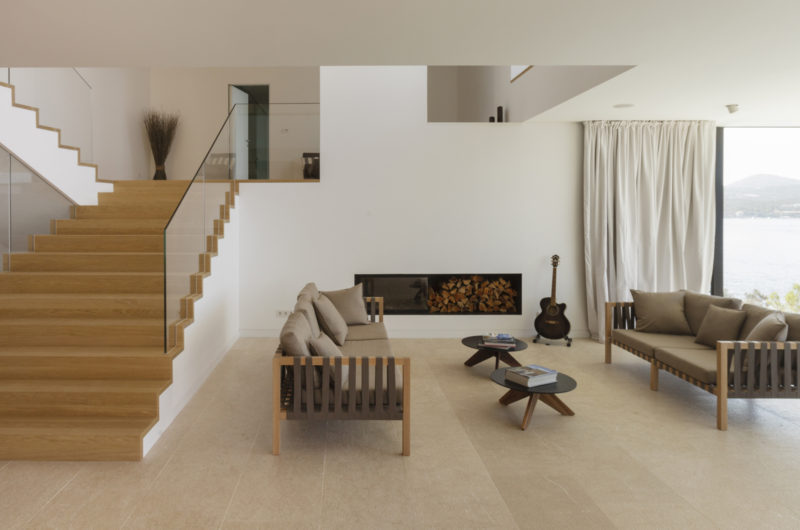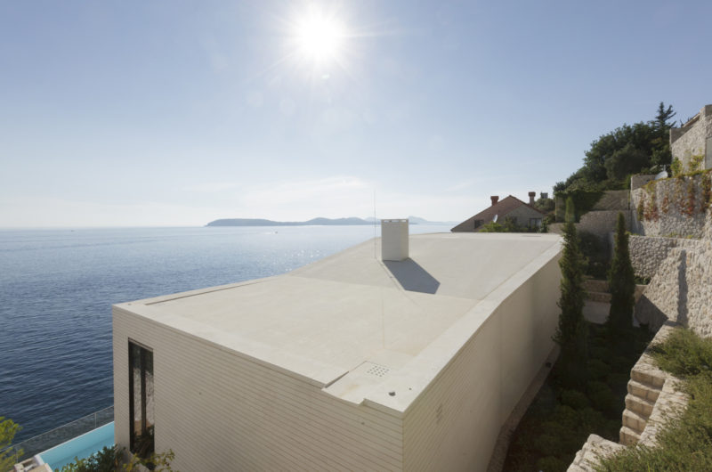 The body of the house is incorporated into the landscape and is defined by the undulating roof plate. The construction features simple and geometric forms and white stone facades, which make it blend perfectly with the surroundings.