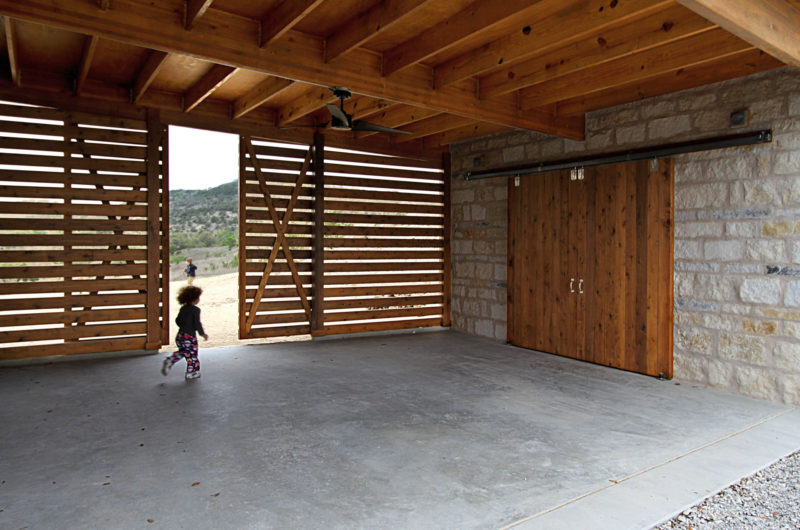 The 2,200 square-foot, cross-shaped building is organized as three masonry boxes that flank a central glass and timber wing great room that rises to the south maximizing panoramic views of the valley and distant hills framed by the big Texas sky. The third masonry box is storage unit anchoring the structure into the northern sloping site. The 2 ½ car garage, required by deed restrictions, doubles as a dining pavilion, open to framed views to the east and west. A lattice screen provides sun control and privacy with rolling screens that open to frame sunsets – an integral ingredient – to family evening meals, while a large ceiling fan overhead provides air circulation on hot summer nights.