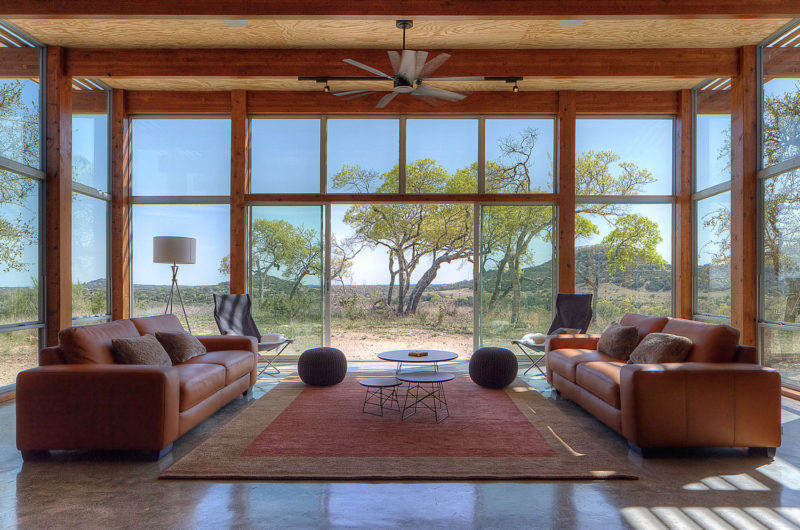 Since it is a weekend home after all, the Brushytop House features a rustic, simple exterior appearance that is complemented by more than adequate living conditions. In order to guarantee unrestricted views of the rugged Texas landscape, the architects decided to include multiple large windows in the design, which also play a key role in allowing natural light within.