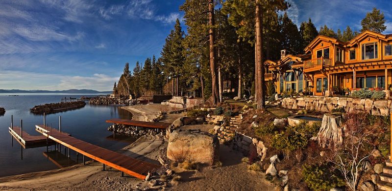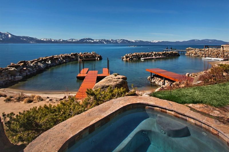 The Lake Tahoe Estate is a spectacular sunny Nevada lakefront property with private crystal clear harbor and white sandy beach.
