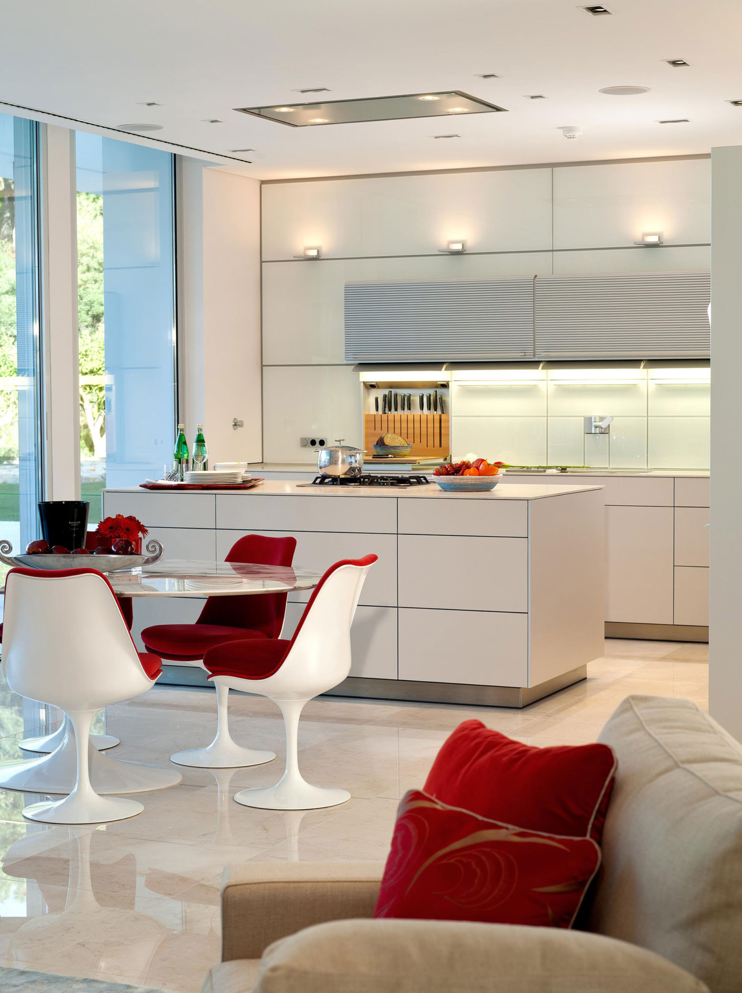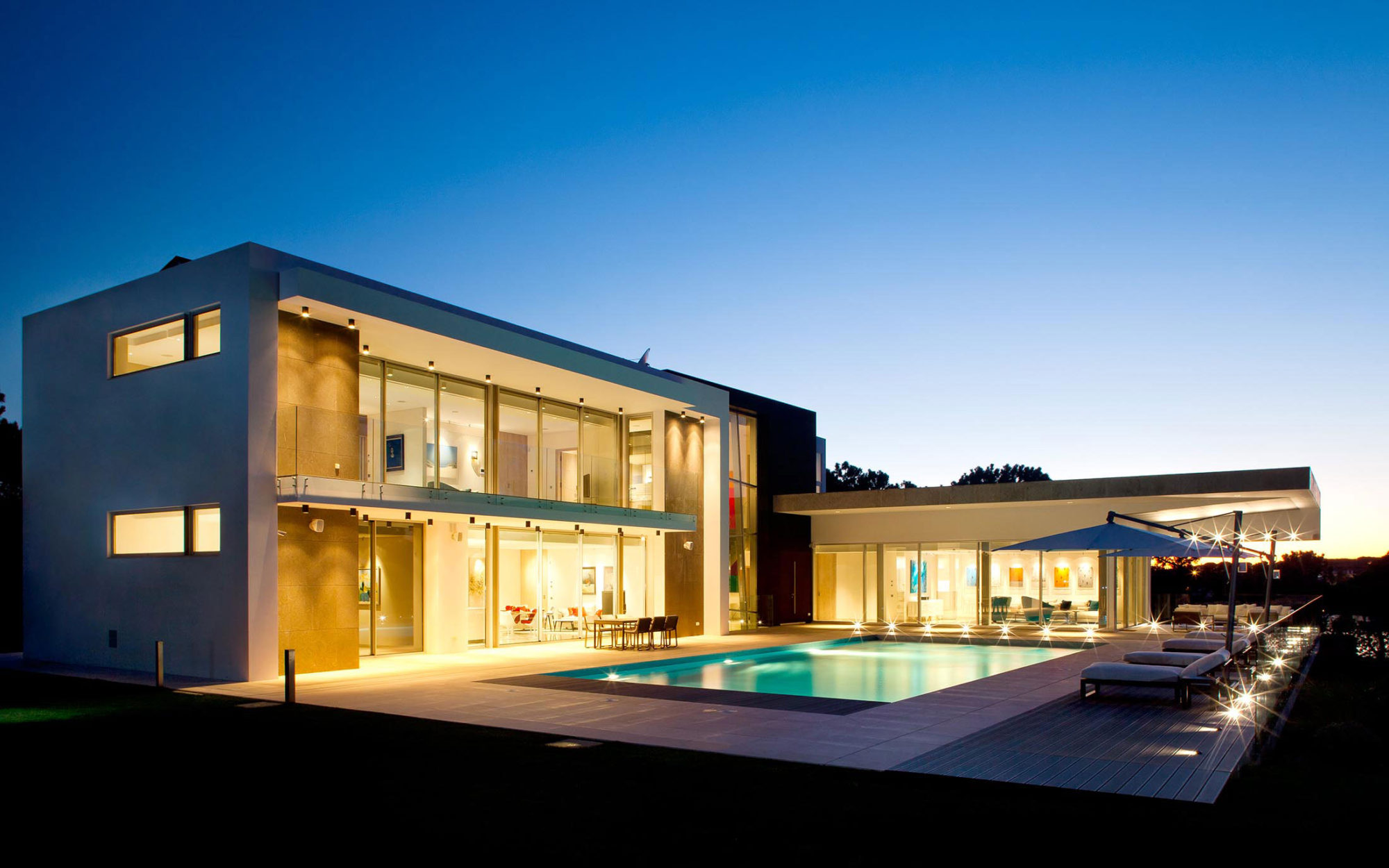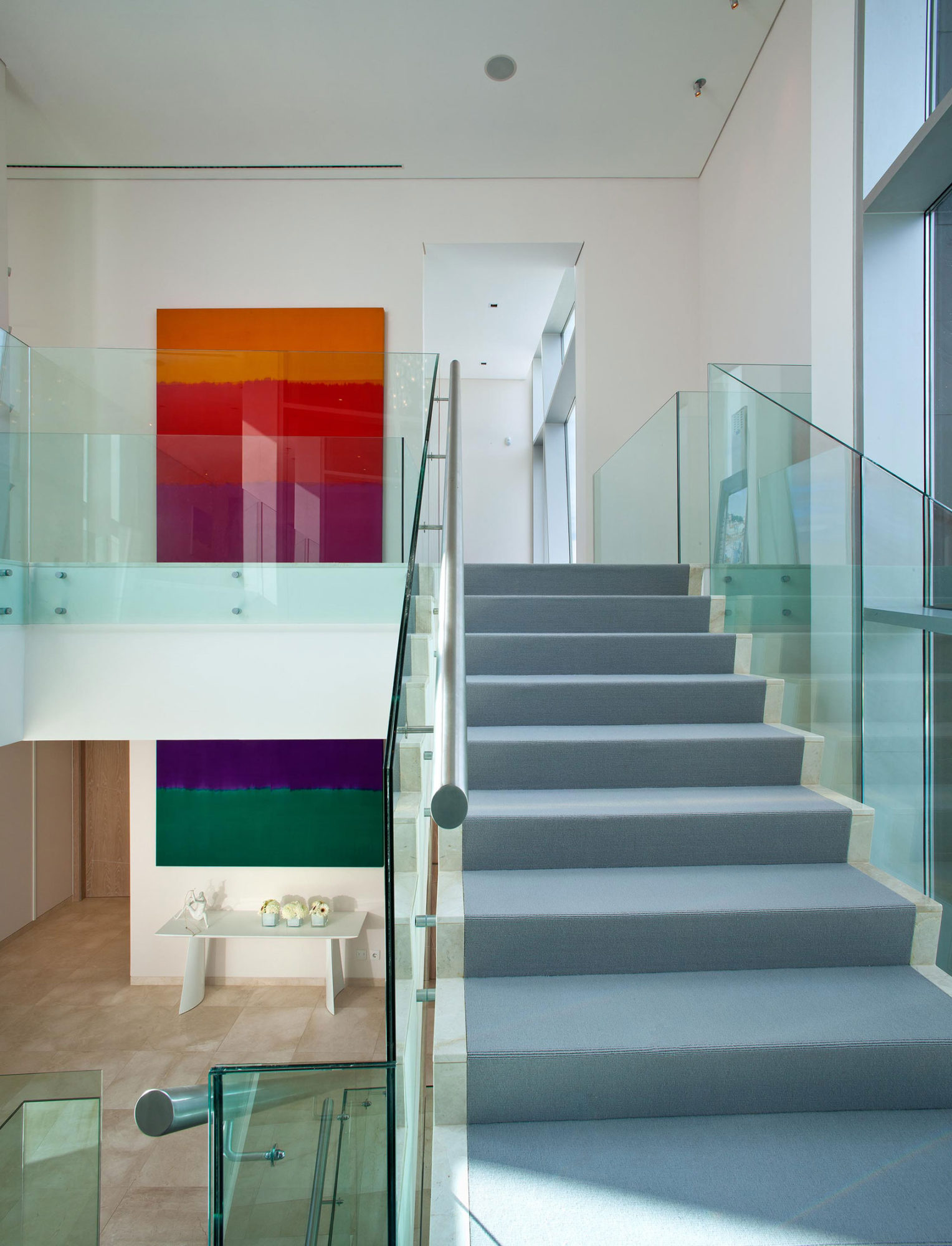 The interior arrangements involve crisp white walls as well as colorful décor elements in the form of paintings and natural plants. The furniture pieces are modern and elegant, while the lighting systems are integrated masterfully into the ceilings and into the outdoor decks.