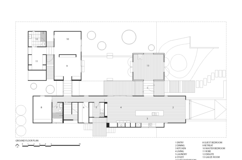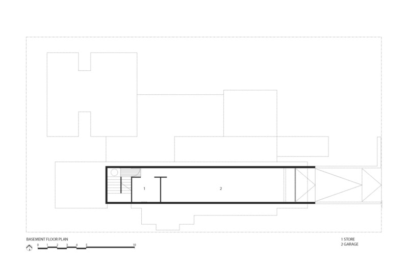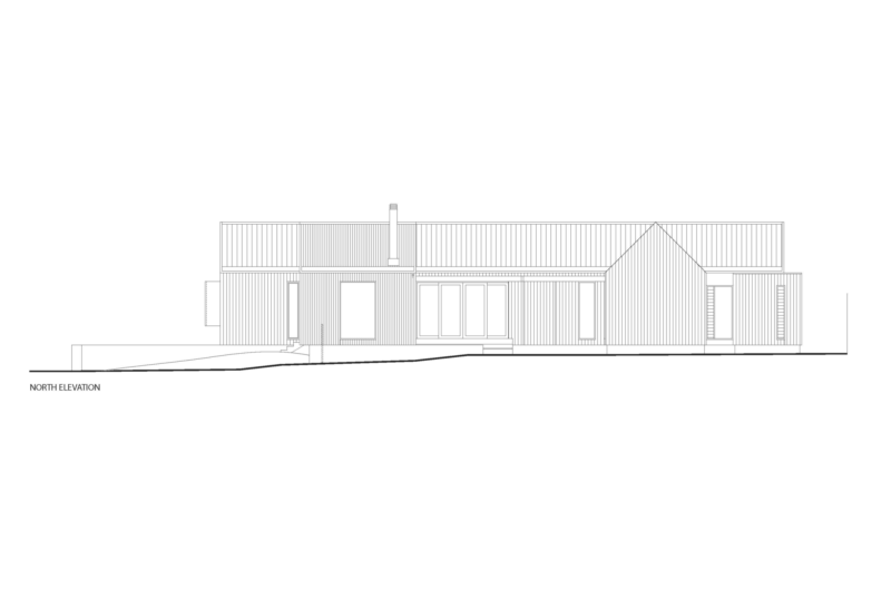 The layout is divided into three main pavilions that are separated by glazed connections to the northwest, northeast and south, all enveloping a courtyard garden to the north. The master bedroom and the retreat are placed in the northwest pavilion along with an outdoor shower, while the southern pavilion contains guest accommodations, a study, laundry facilities and the main living space that boasts beautiful views of the nearby river. The northeast pavilion flaunts a shaded room that benefits from two large barn doors to the east and west that provide ventilation when opened during the summer and warmth and shelter when closed during the winter. This room is faced towards the street side, and it is not separated by a fence, in order to maintain a connection with the passersby and the neighbors.
