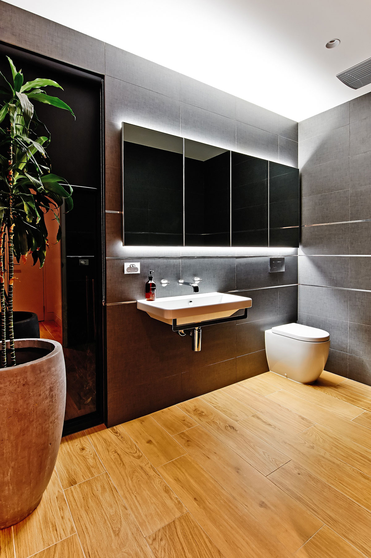 The powder room offers the same rich palette as the Ensuite. The addition of polished listello strips provide further sophistication to the fabric textured wall tiles.