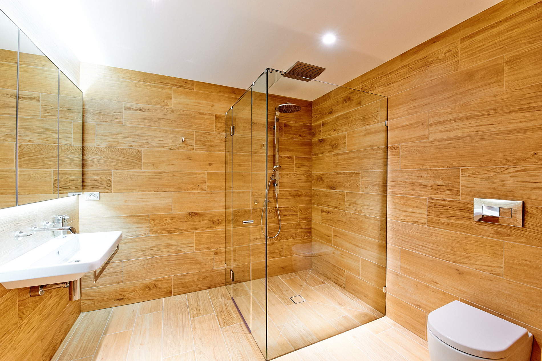 Following through on the theme of the adjoining timber sauna, the Pool House Bathroom has a warmer Scandinavian feel.