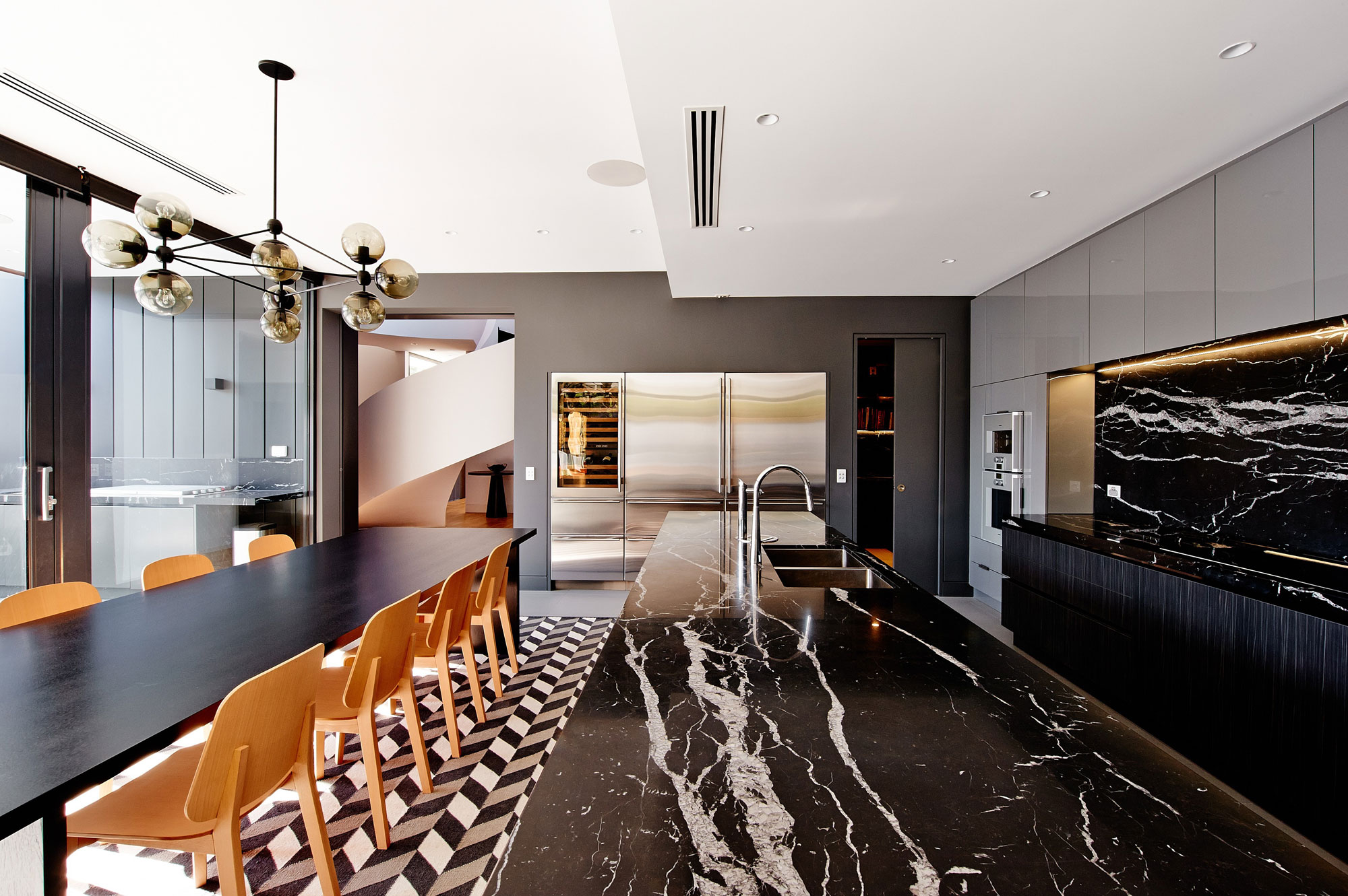 The central atrium boasts a sculptural sinuous stair and a walk bridge, both of which immediately draw the eye. Moving on to the kitchen, we find Nero Marquina benchtops as well as stone and timber veneer elements complemented by high gloss metallic finishes. There is also a large butler style pantry nearby that provides extra workspace and storage facilities.