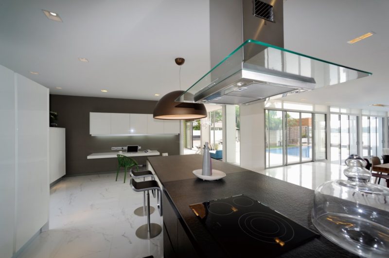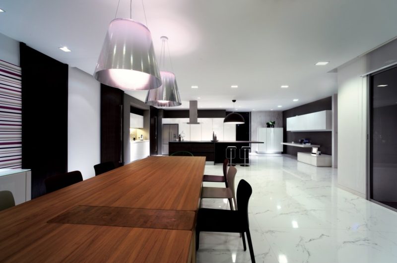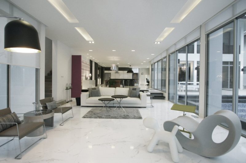 Because the initial idea was to build the house according to the mythical kingdom Shambhala, the designer kept the essence of the concept by various elements, one of them being the large floor –to- ceiling windows that allow natural light to flood the home, also bringing the homeowners closer to nature.