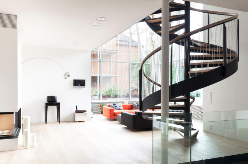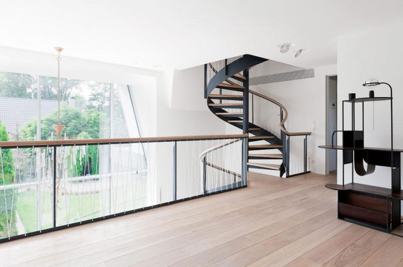 The residence features 2 levels that are linked via a spiraling staircase. The bedrooms boast simple, clean designs that revolve around comfort and intimacy, which is why they include single beds and some colorful seating arrangements for contrast. However, the master bedroom is a bit different in this regard, since it boasts a large bed as well as a superb bathtub.
