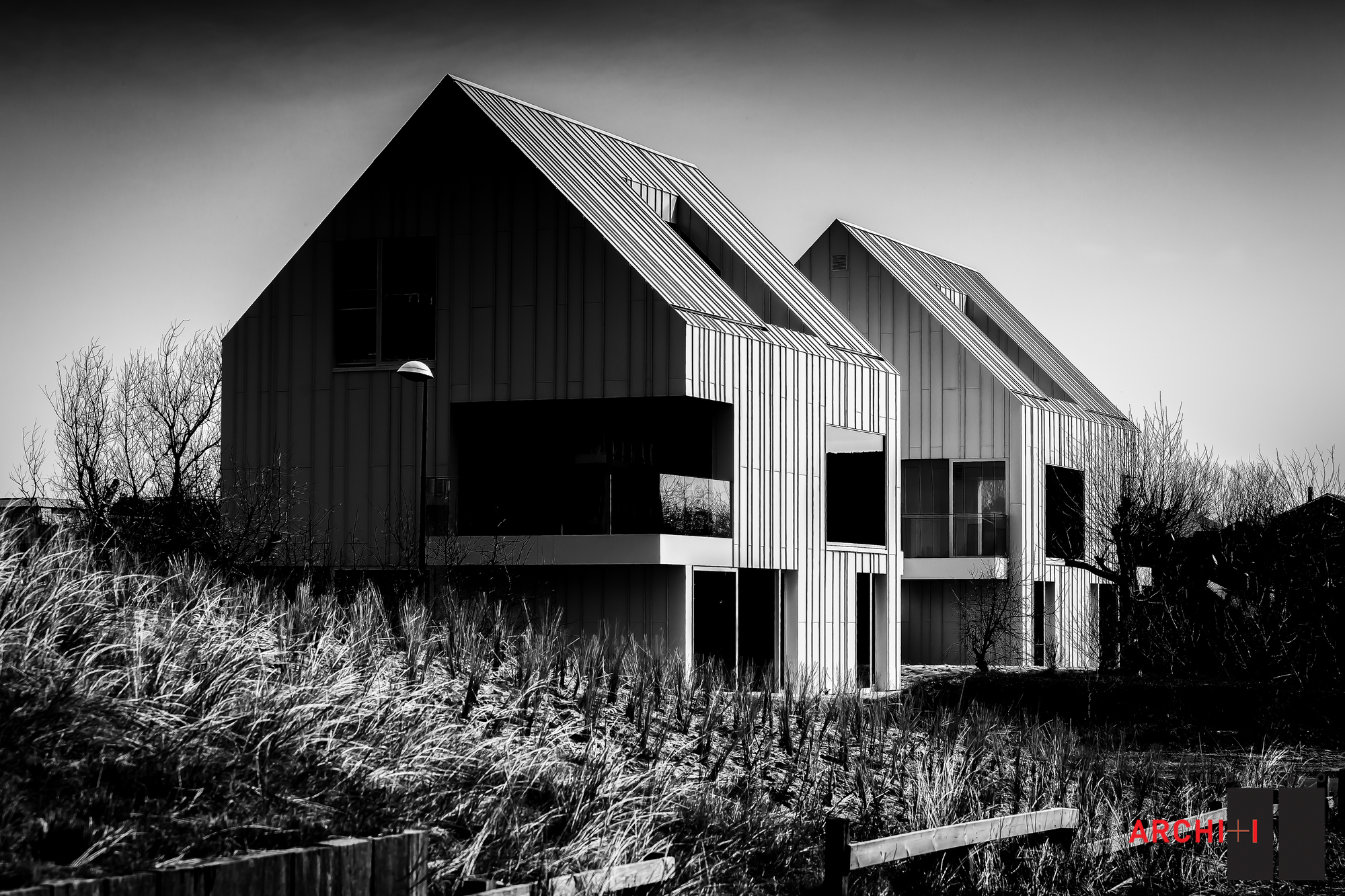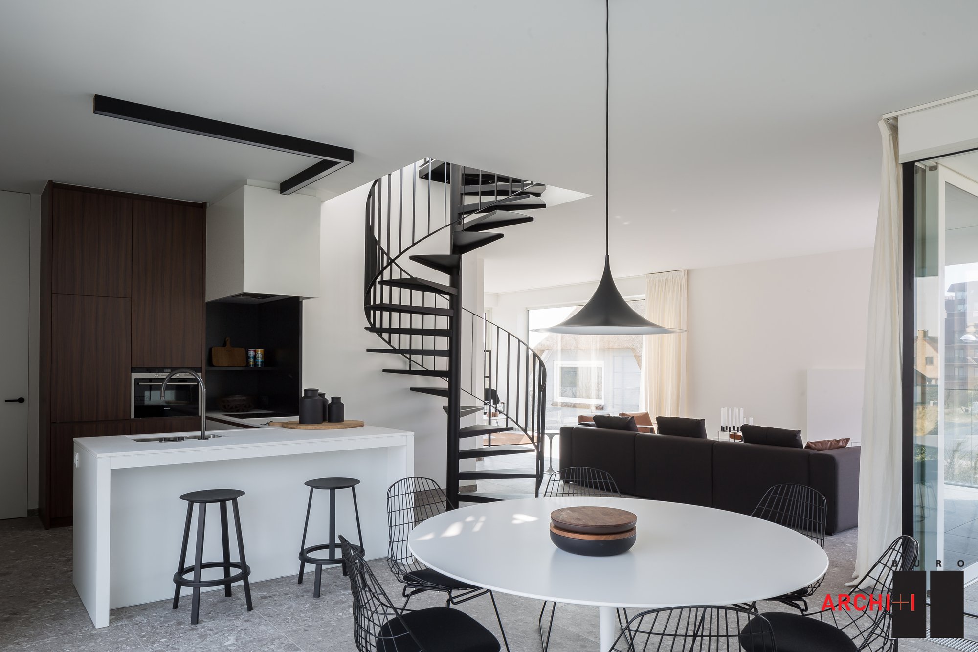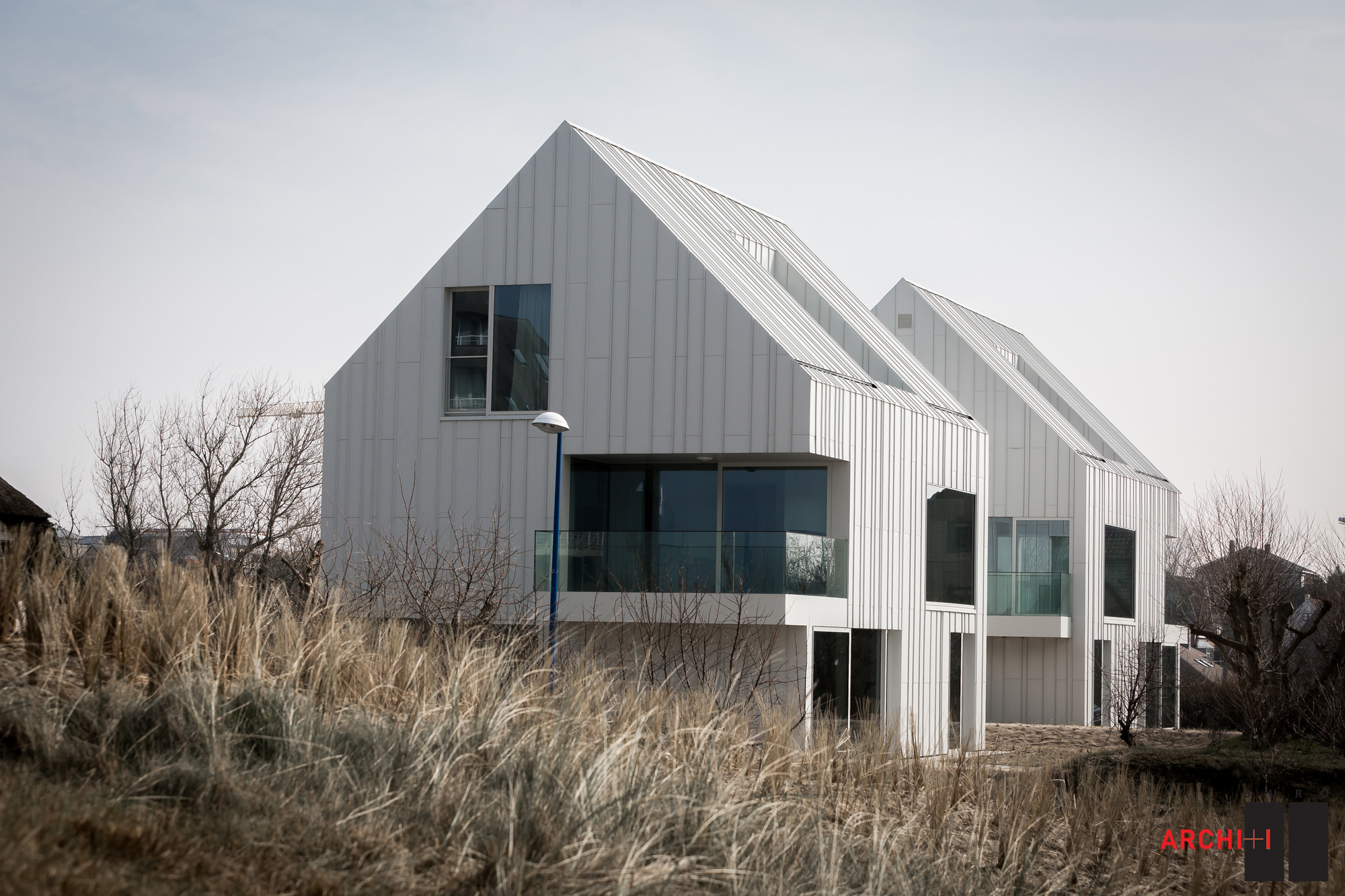They each include two stories and an attic, and each floor comprises a three-bedroom apartment or a duplex. Access between the different levels is ensured by indoor spiraling staircases that boast seemingly floating steps. Designed following principles of white coastal architecture but with a modern twist, the abodes feature white aluminum facades and roofs. Outside, dune grasses adorn the terraces and frame the pathway leading to the entryway.