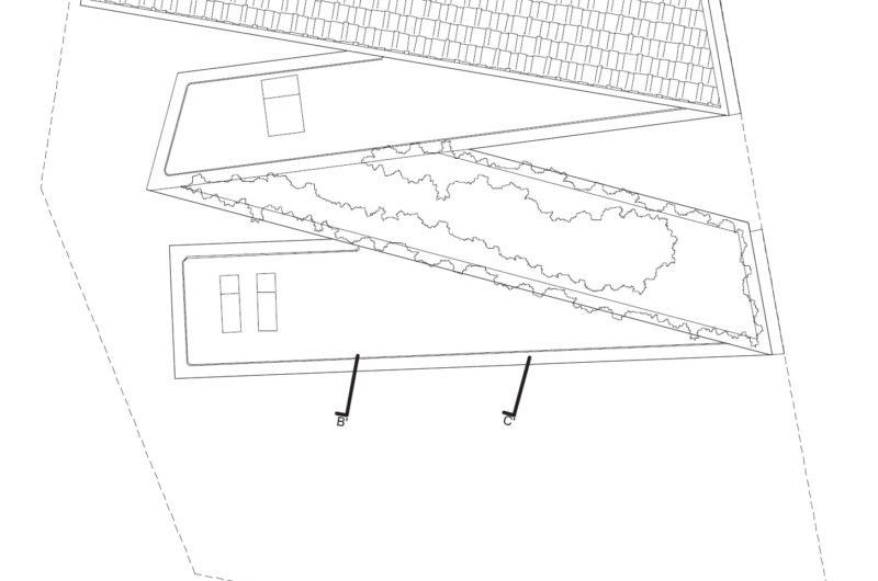 Because the building adjoins a large lake, the architects designed the house as a system of elongated volumes, each with one side facing the lake. The sloping plot forced the architects to stack the three volumes in a zigzag pattern, with open terraces and sheltered patios between them.