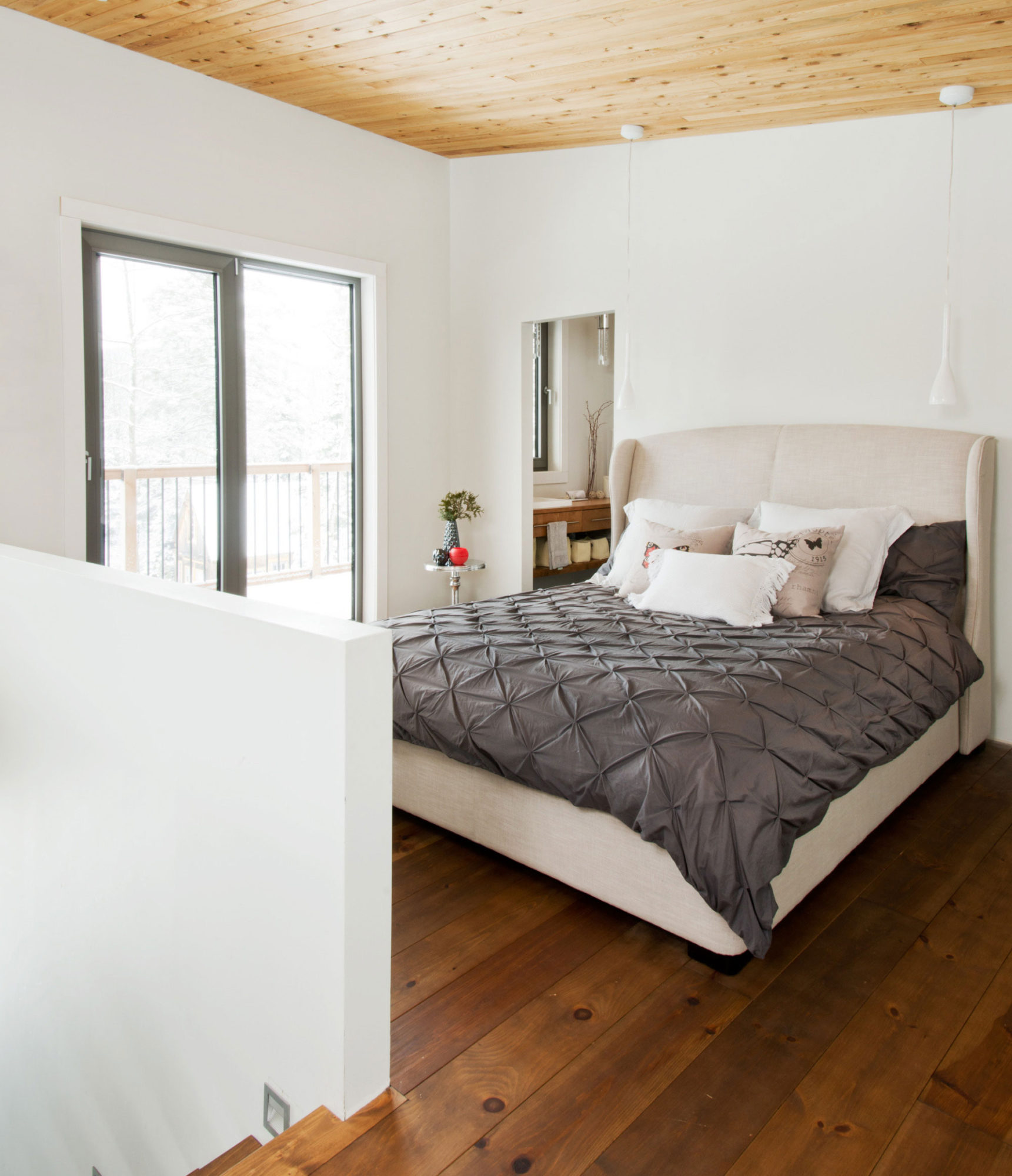 The floors, ceilings, doors and staircase are made out of wood, and so they strengthen the warm and welcoming ambiance found throughout. The staircase leads directly to the bedroom, which flaunts a comfortable bed as well as immediate access to a bathroom and a balcony.