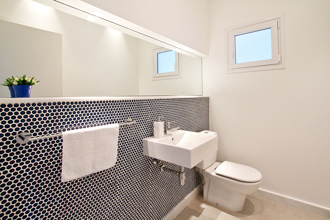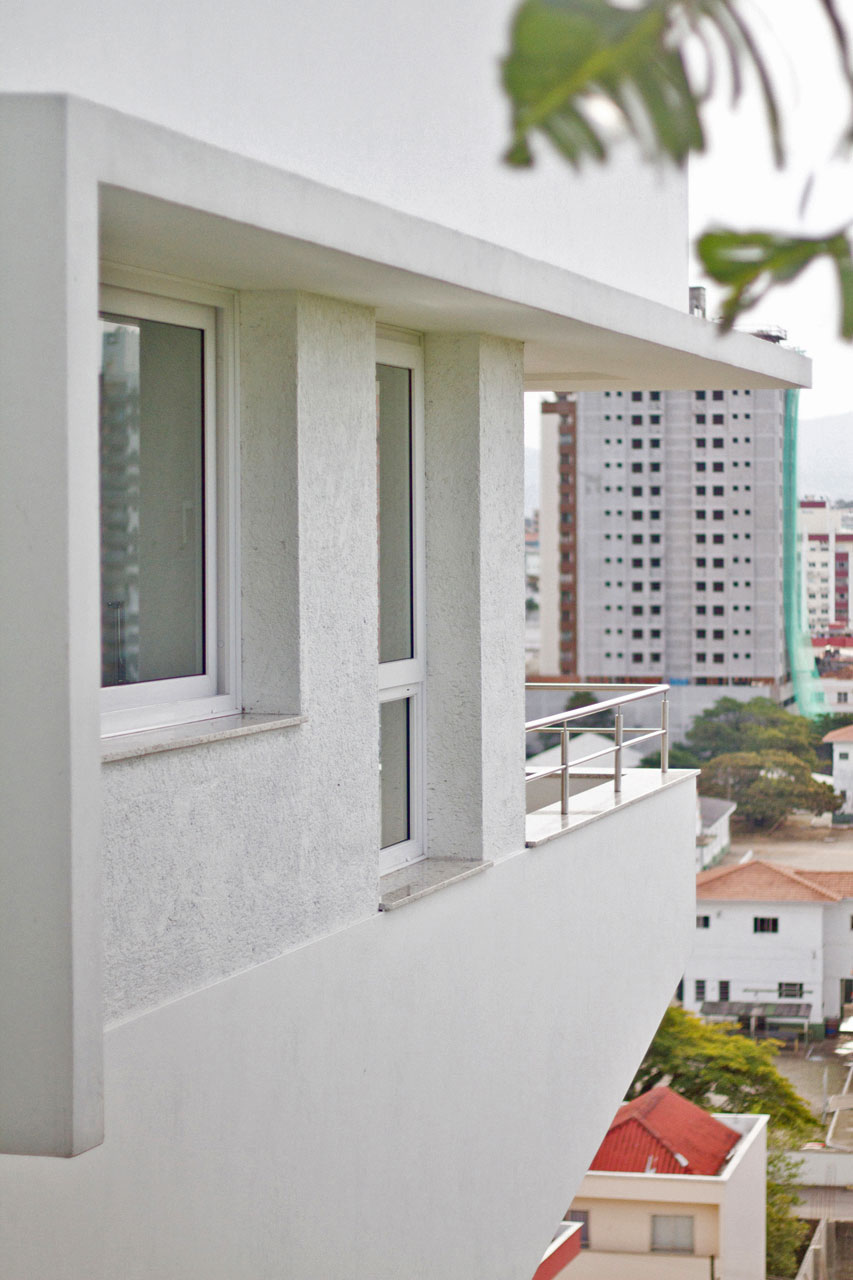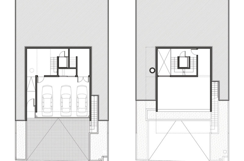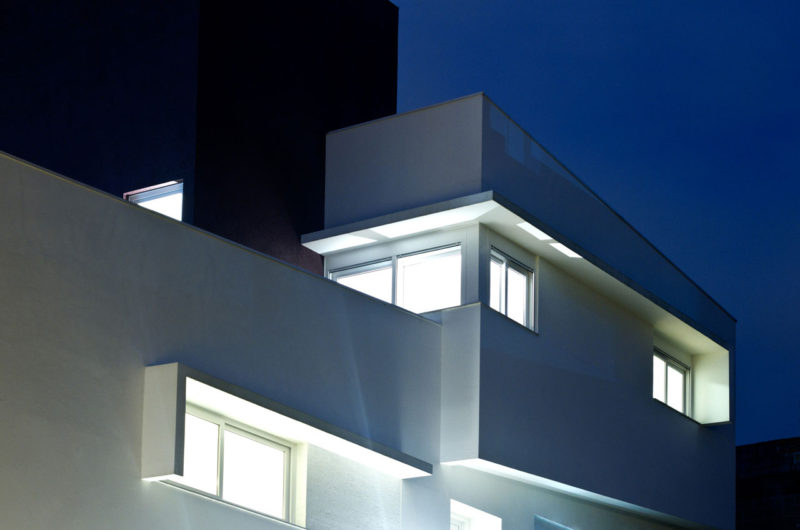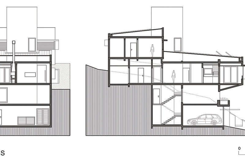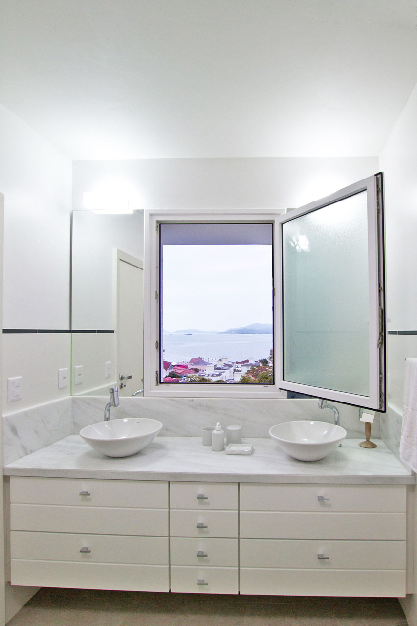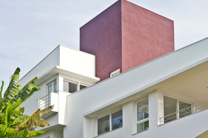 The different levels of the house are connected by a staircase and an elevator, and they have different functionalities. Floating above the driveway is a white cantilevered structure with lovely sea and city views, and excellent cross ventilation and sunlight. This level hosts the kitchen, a workshop and service area.
