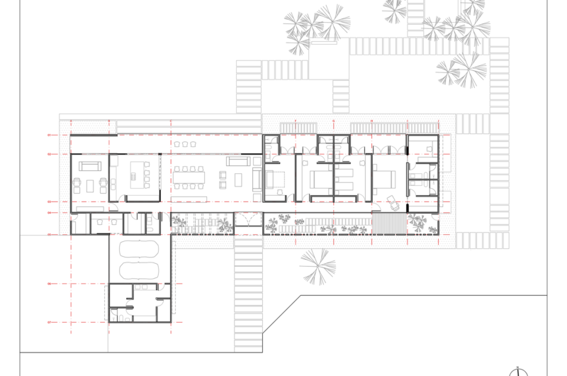 The fence wall that encircles the residence was put together using reinforced concrete strips of different widths, which create a simple yet beautiful display without revealing too much of the interior courtyard. The residence itself is as contemporary and as comfortable as you would expect from a high-end project from 2013. The main living areas are spacious, welcoming and outfitted with modern furniture pieces complemented by a carefully chosen array of finishes and textures. Open spaces and large floor-to-ceiling windows blur the boundaries between the indoor and outdoor spaces while helping create an enviable atmosphere of comfort and wellness.