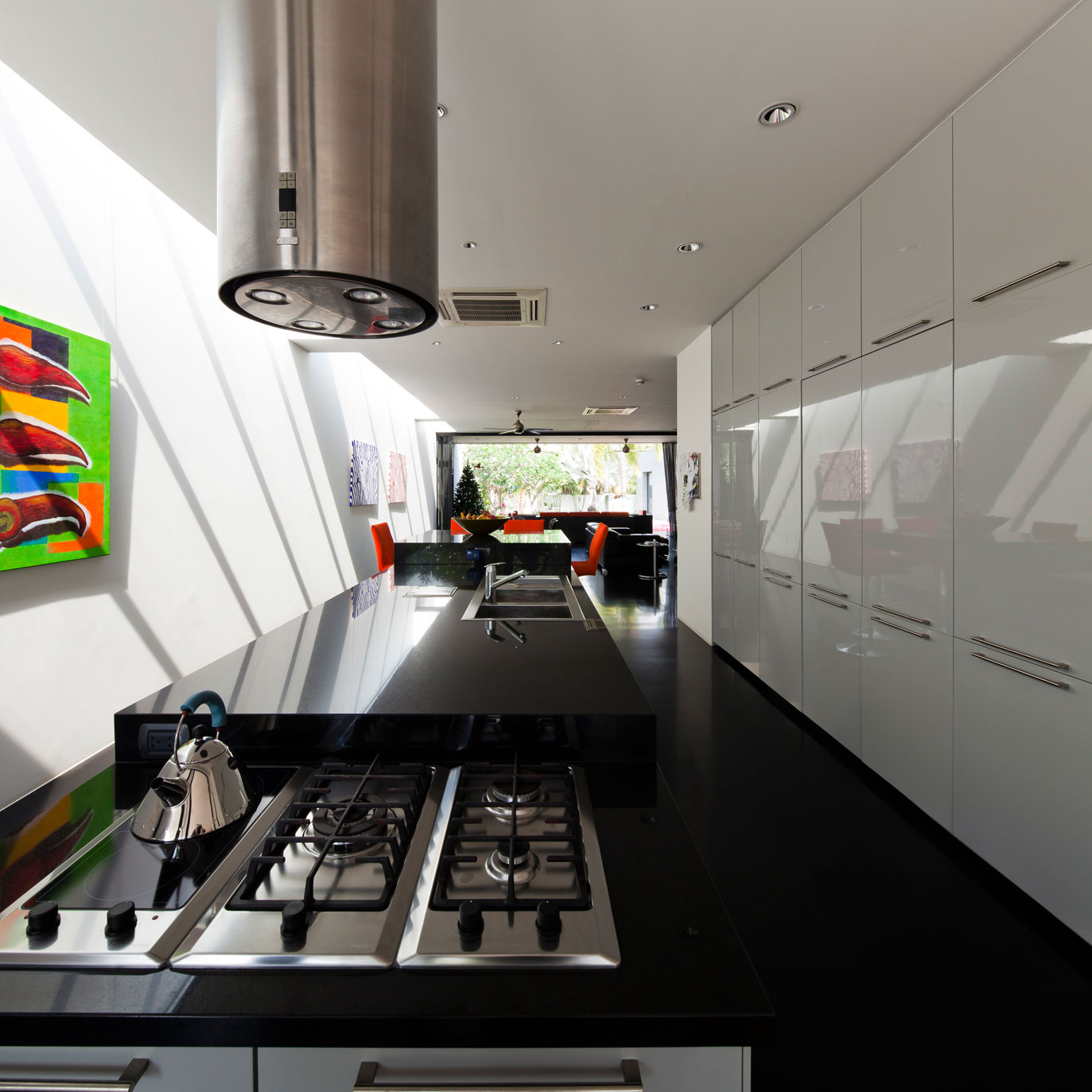 The crisp white walls in the living room contrast nicely with a pair of colored zebra paintings in red and purple, not to mention the comfortable black leather couch and the dining table chairs. The living room features a direct link with the outdoor areas and offers perfect relaxation and socialization opportunities. The kitchen is equipped with modern appliances and boasts a medium sized table with boldly colored orange chairs.