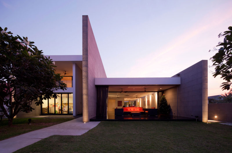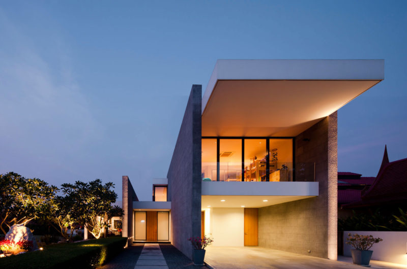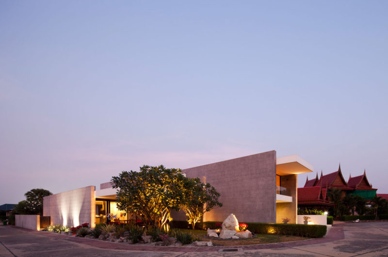 Residence Banglamung is a modern home that was sketched out by the expert architects at DBALP. It features a beautiful, organized exterior appearance as well as irreproachable living conditions that help it support a luxurious and carefree lifestyle. Thanks to its generously sized windows, the house is very well lit naturally throughout the day and flaunts amazing views of its surrounding environment.