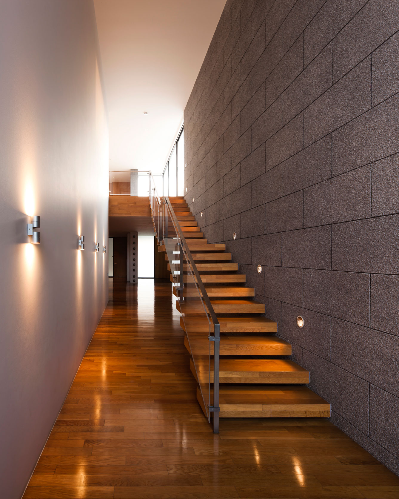The 2 levels of the house are connected by a superb floating staircase that includes wooden steps and glass railings.