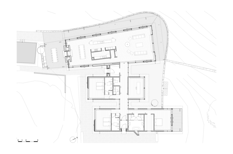 A curved veranda is unveiled by opening the large timber sliding doors of the house.