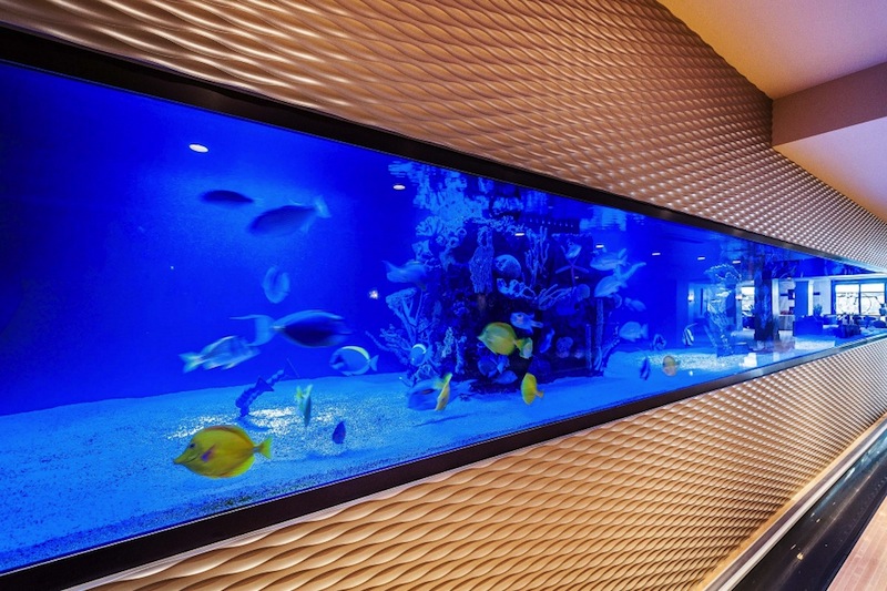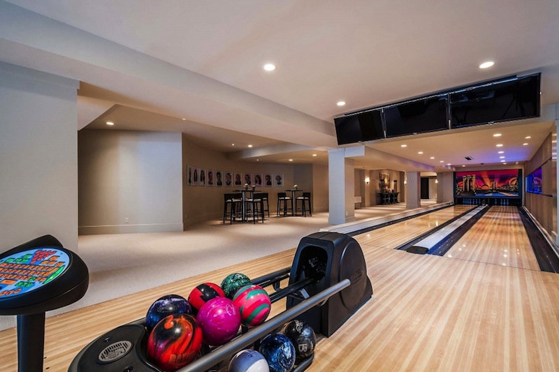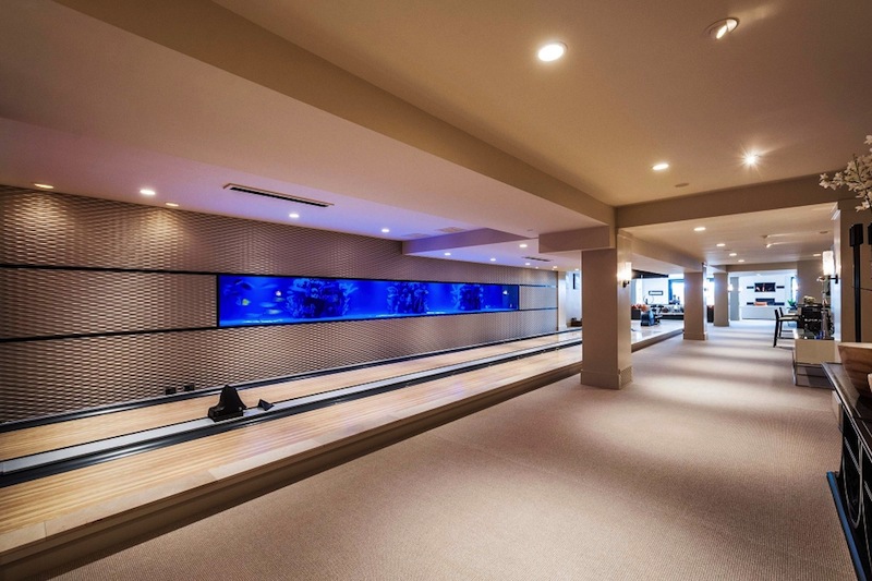 The lower level is reserved for entertainment: a 2-lane bowling alley with a 3.500 gallon wall salt-water aquarium and a family room with a TV and sitting area.