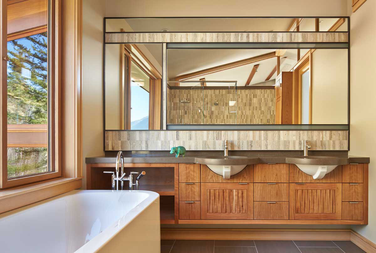 Deep roof overhangs, built-in shades and high operating clerestory windows are used to reduce heat gain in summer months. During the winter, the lower sun angle is able to penetrate into living spaces and passively warm the exposed concrete floor. Low VOC paints and stains have been used throughout the house. The high level of craft evident in the house reflects another key principle of sustainable design: build it well and make it last for many years!