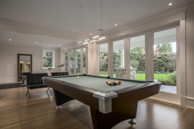 Descending to the lower level, we discover a gym, the nanny’s bedroom with ensuite, a theater room and billiards room that open up to mature gardens.