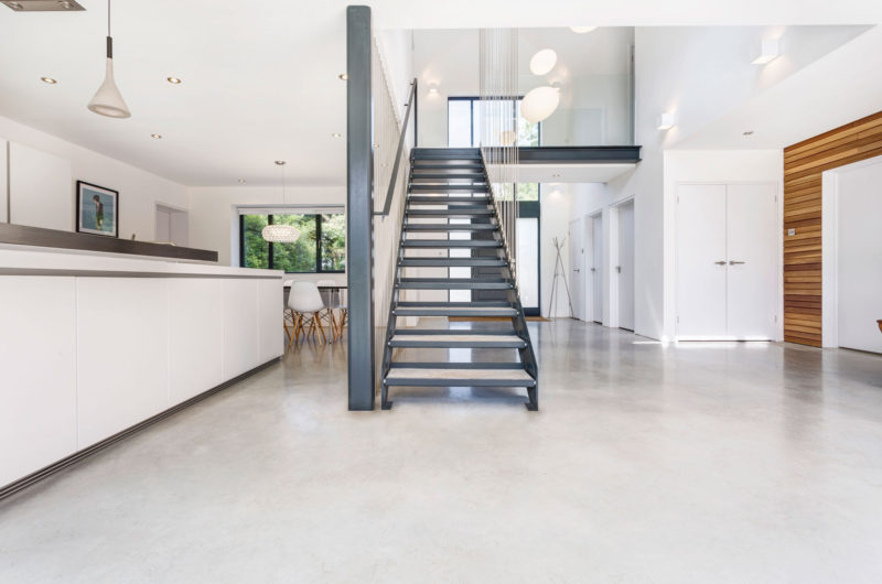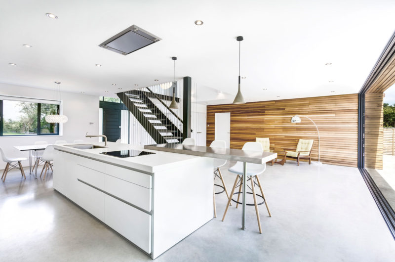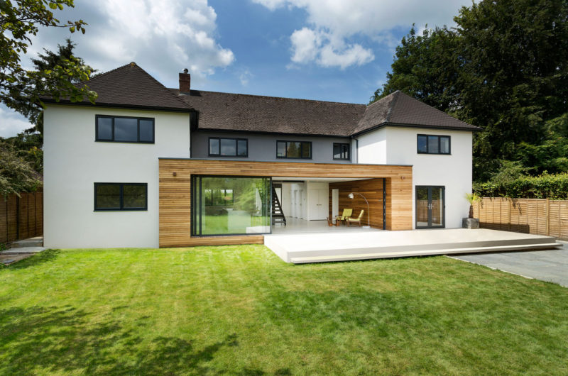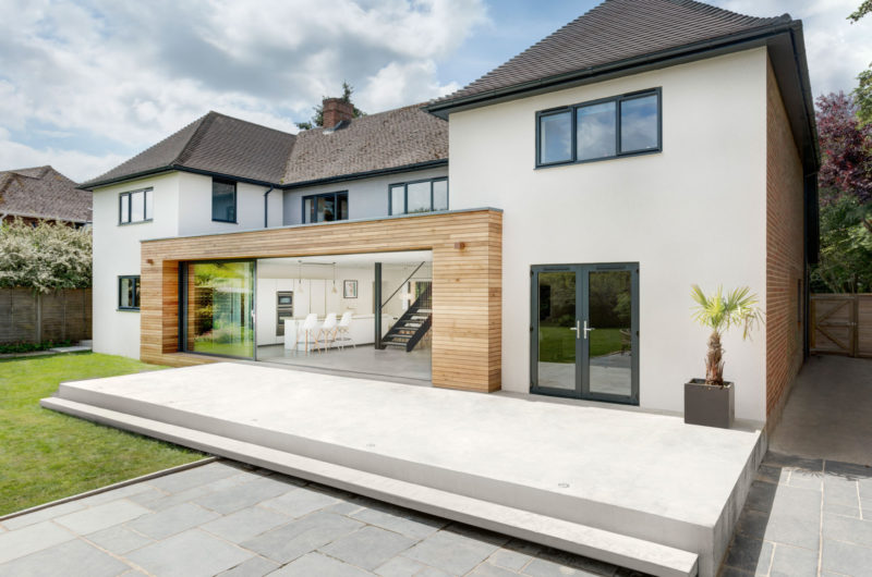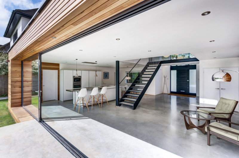 At the rear of the property a central timber form connects the two wings of the house and projects into the garden creating an architectural form that ties the whole project together. A large concrete plinth that steps down to the garden creates a place to relax and dine outdoors. The concrete plinth flows into the property and makes up the entire ground floor surface. This use of material, mixed with the large sliding glazed panels that face onto the garden, blurs the boundary between indoors and outdoors.