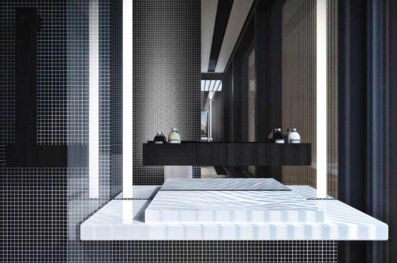 The living room flaunts two comfortable white sofas, a flat-screen TV, two narrow floor-to-ceiling windows and contemporary lighting systems. Still, the most impressive area within the YT 9 House is the main bedroom, which boasts a minimalistic design based on comfort and simplicity. It features a large bed as well as a fireplace, wooden floors and a sunken rectangular bathtub.