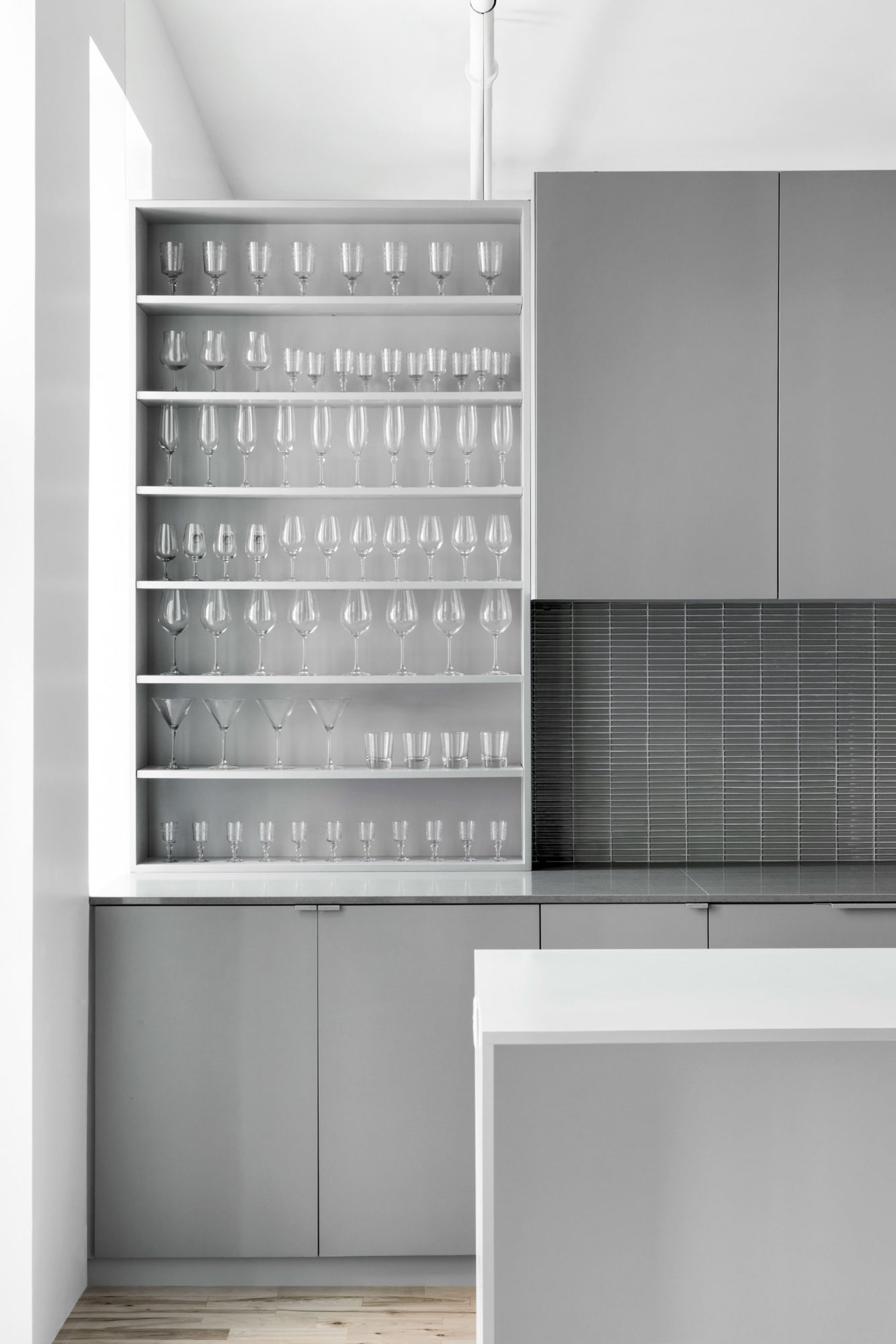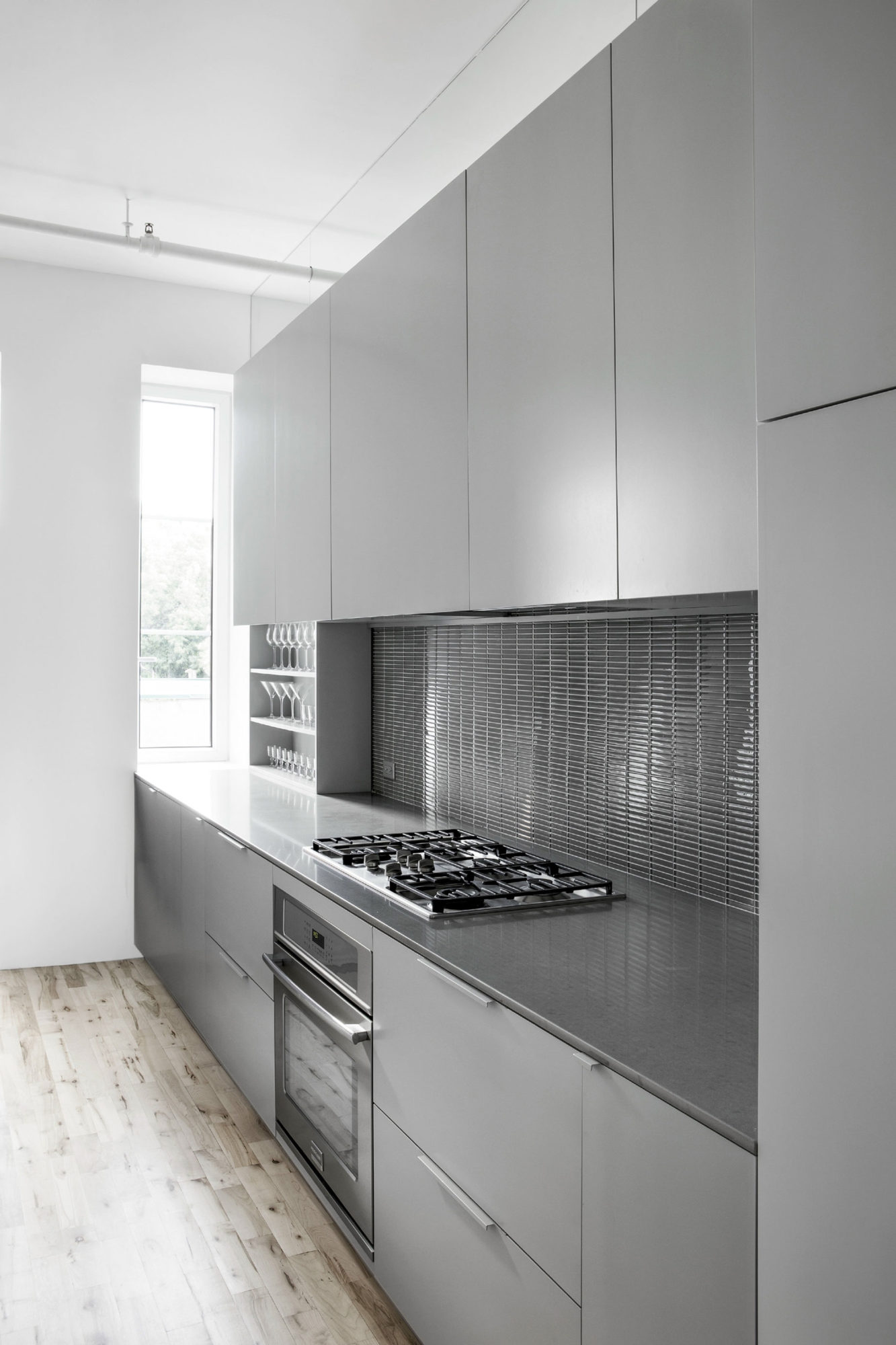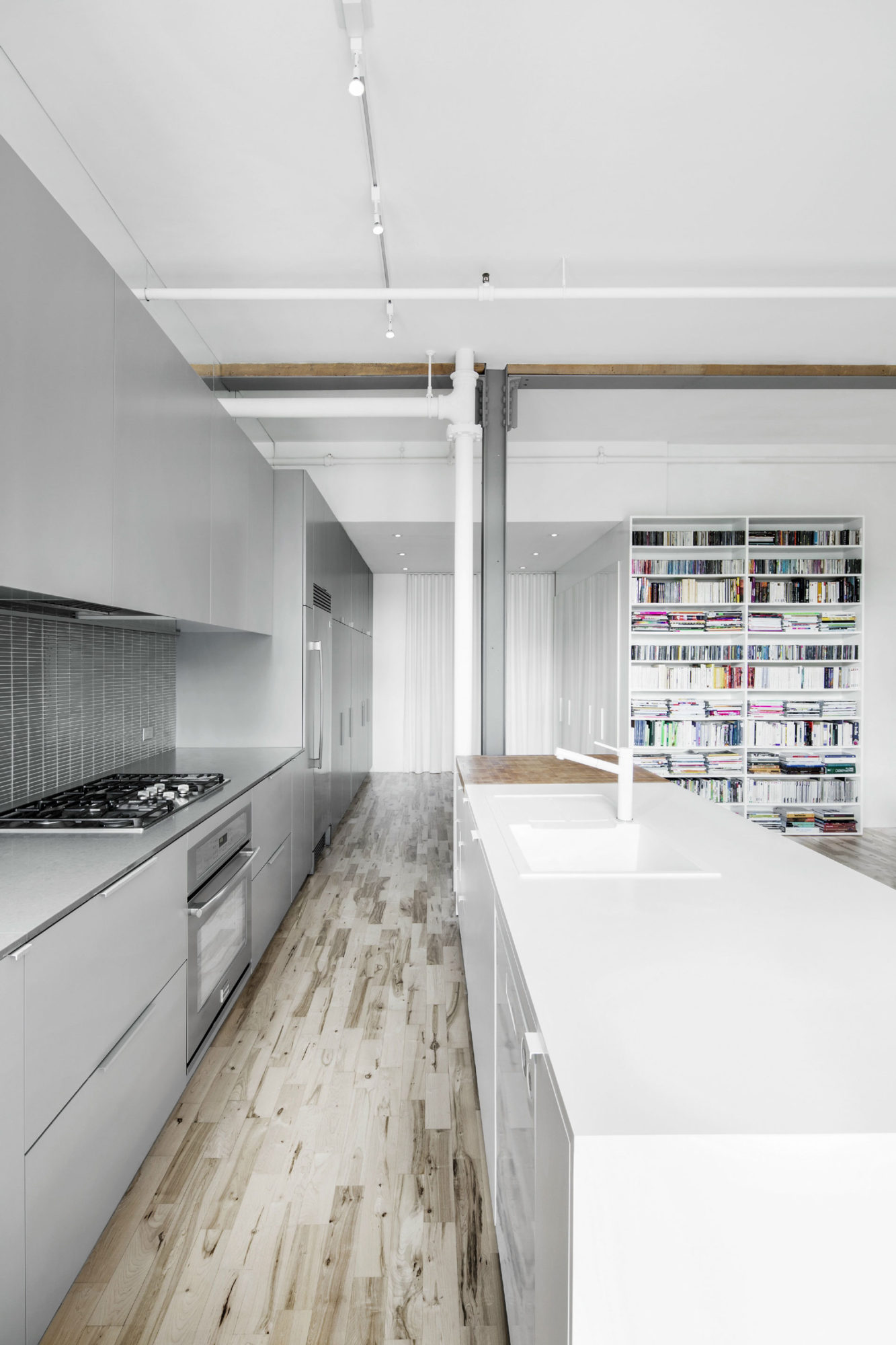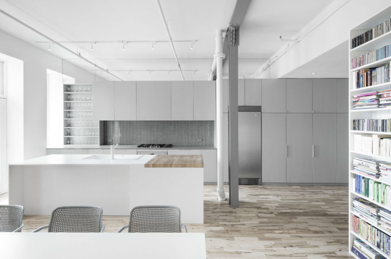 The superb Espace St-Dominique can be found in Quebec, Canada, and it was designed by specialists from Anne Sophie Goneau Design. Oozing elegance and sophistication at every turn, the main living areas of the abode feature an extensive monochrome pattern based on shades of gray and white that contrasts beautifully with dark red furnishings and light brown hardwood floors.