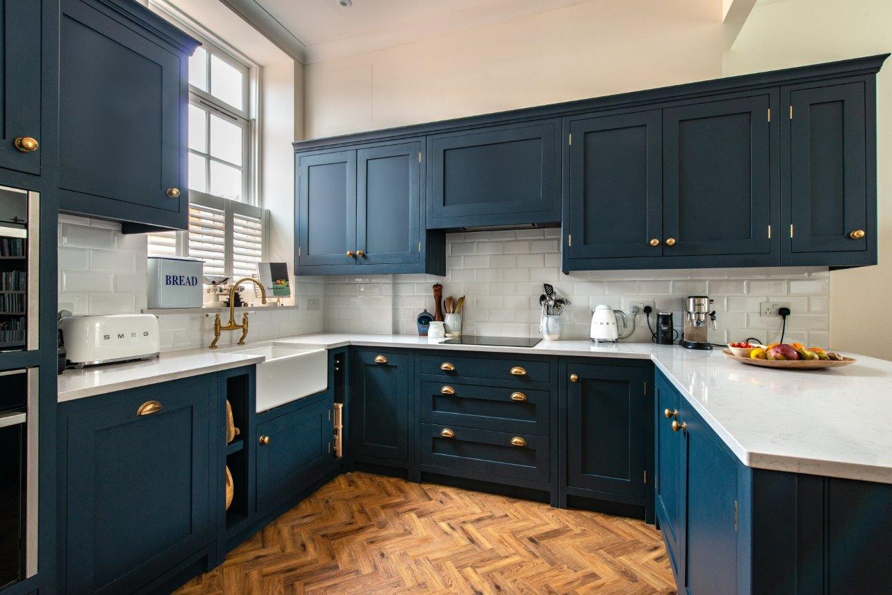 Thirdly Dark Blue, to add drama to your kitchen in 2023, opt for a dark blue kitchen colour. Navy and deep blues are ideal for creating a luxurious kitchen, while still keeping it modern. Pair dark blues with lighter shades of grey or white to break up the darkness.