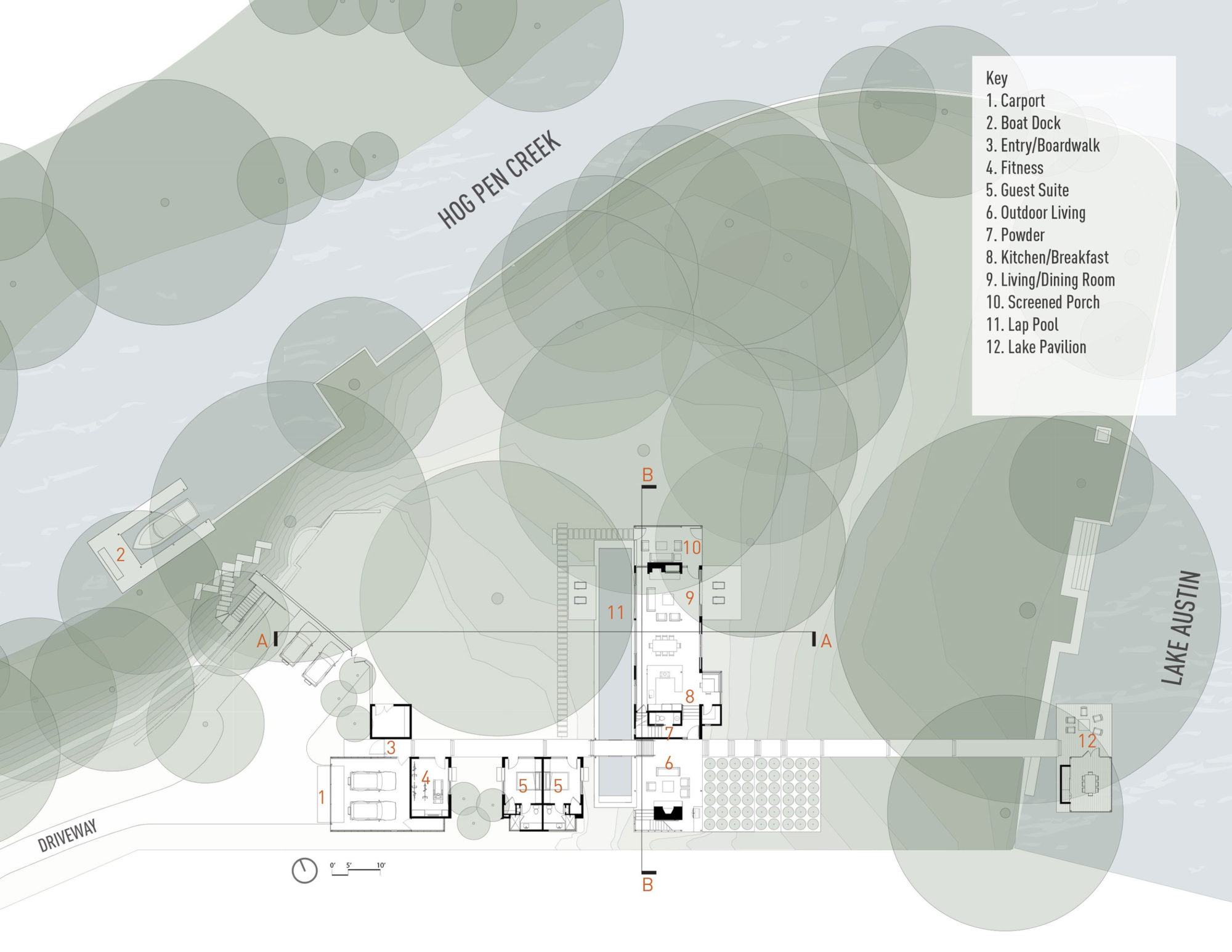 The Hog Pen Creek Residence is situated on the shady, tree-covered confluence of Hog Pen Creek and Lake Austin. Embracing its informal, rural roots, the owners envisioned a place that engaged with the outdoors while providing accommodating spaces for their off-season training for ironman triathlons.