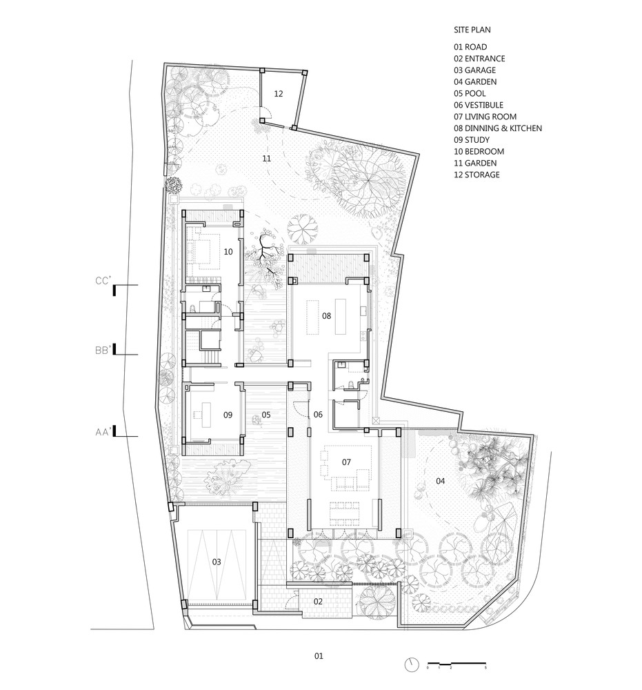 3. All interior spaces need excellent daylight and natural ventilation.Our scheme is to divide the plan into 3 parallel zones, the width are 7m, 4m, 5m respectively, from east to west. The 7m-wide zone holds up the public function such as living, dining and kitchen. And the form of this public building is a one storey pitch-roofed volume with a front porch, which resembles the original bungalow. The 5m-wide zone contains two floors of bedrooms and study. In between of these two volumes is a 4m-wide reflecting pool with a plumeria tree, which mediates the micro-climates and also disperses fragrance in the air.