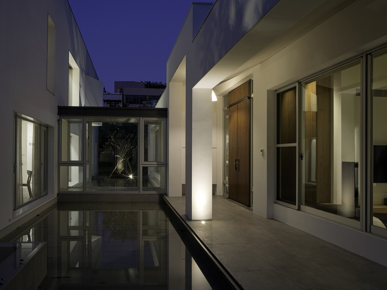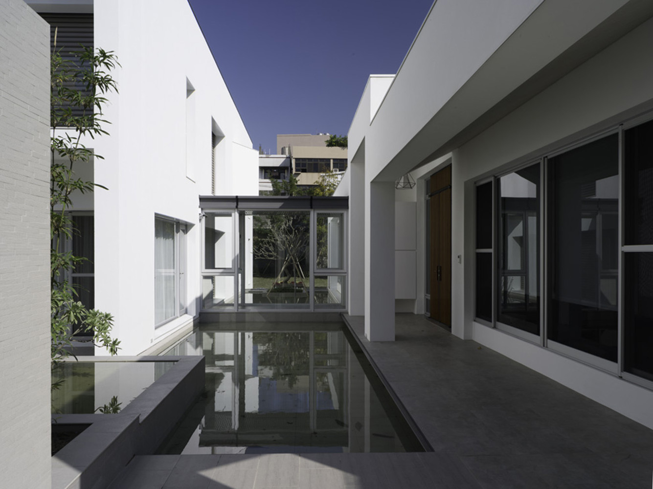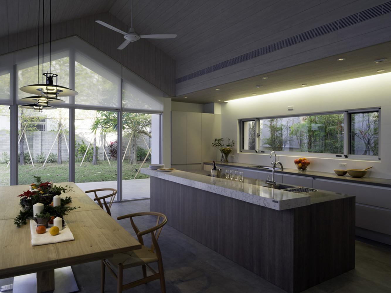 The architects managed to fulfill all of their expectations by separating the layout into three parallel zones. The zones feature different widths of 22.9 feet, 13 feet and 16.4 feet respectively from east to west. The 16.4-foot area incorporates two floors occupied by bedrooms and a study, while the 22.9 feet volume comprises the public areas such as kitchen, dining room and living room. Between these zones is a13-foot wide area that boasts a reflecting pool and a plumeria tree, which adds a touch of naturalness and warmth to an otherwise, modern and minimalistic residence.