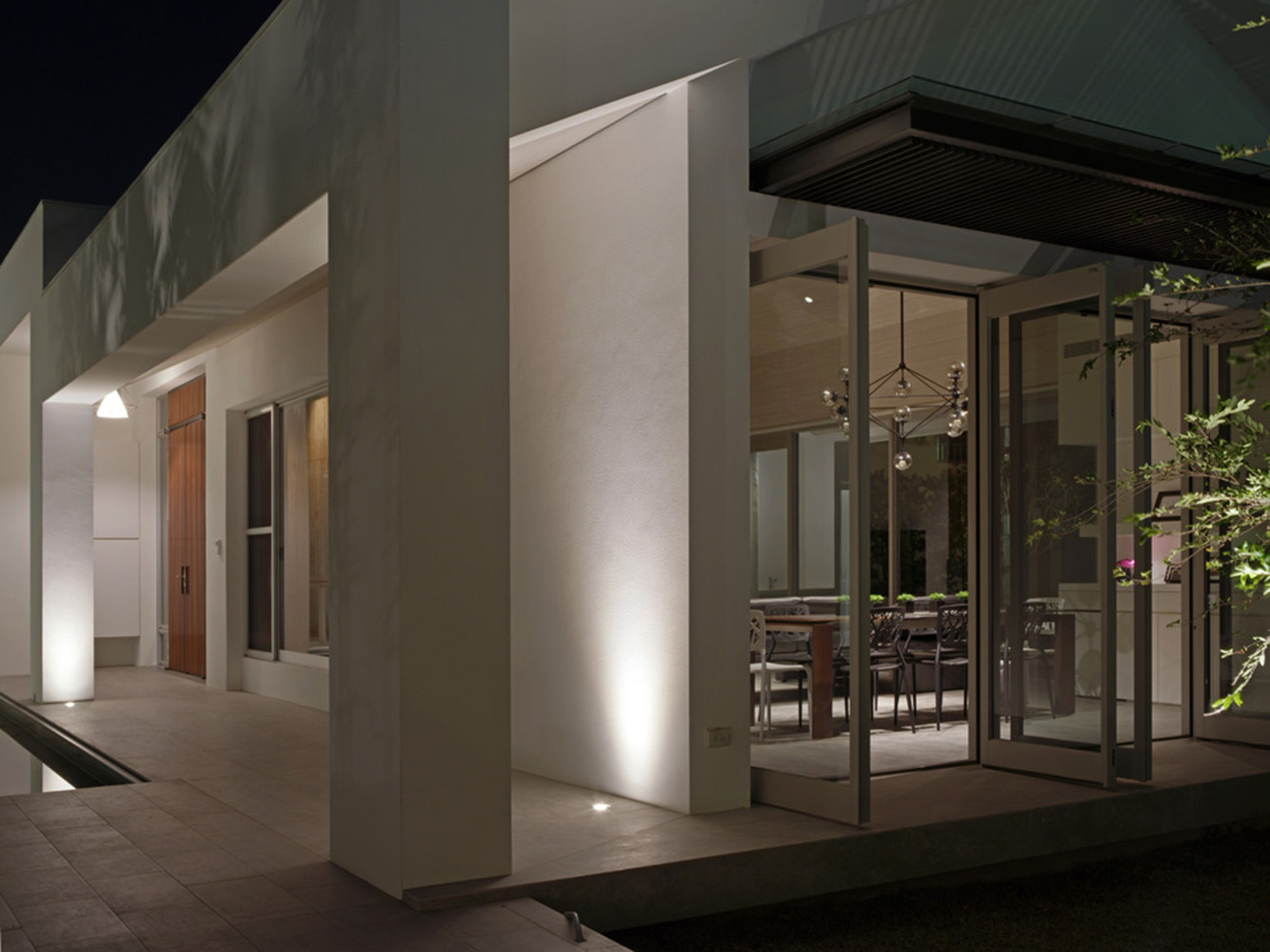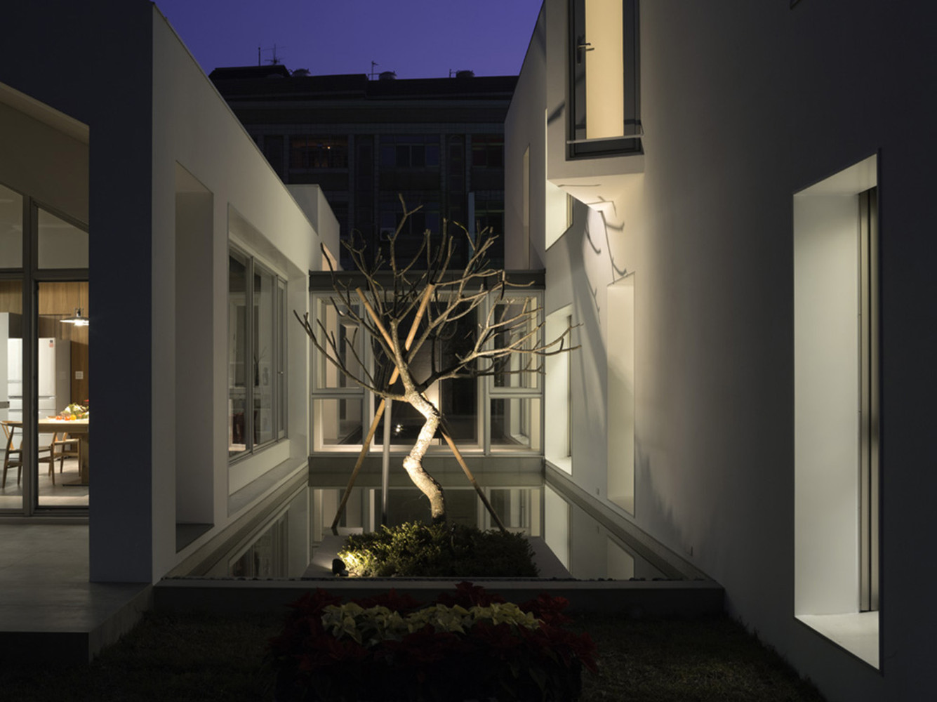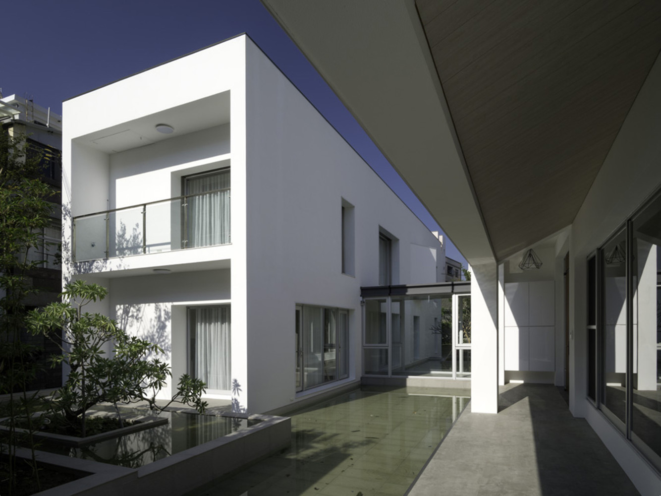 The architects managed to fulfill all of their expectations by separating the layout into three parallel zones. The zones feature different widths of 22.9 feet, 13 feet and 16.4 feet respectively from east to west. The 16.4-foot area incorporates two floors occupied by bedrooms and a study, while the 22.9 feet volume comprises the public areas such as kitchen, dining room and living room. Between these zones is a13-foot wide area that boasts a reflecting pool and a plumeria tree, which adds a touch of naturalness and warmth to an otherwise, modern and minimalistic residence.