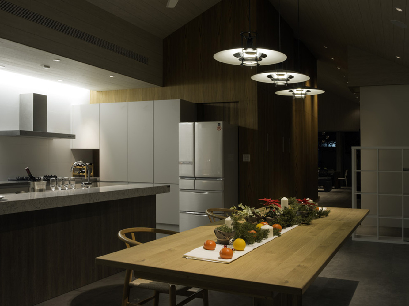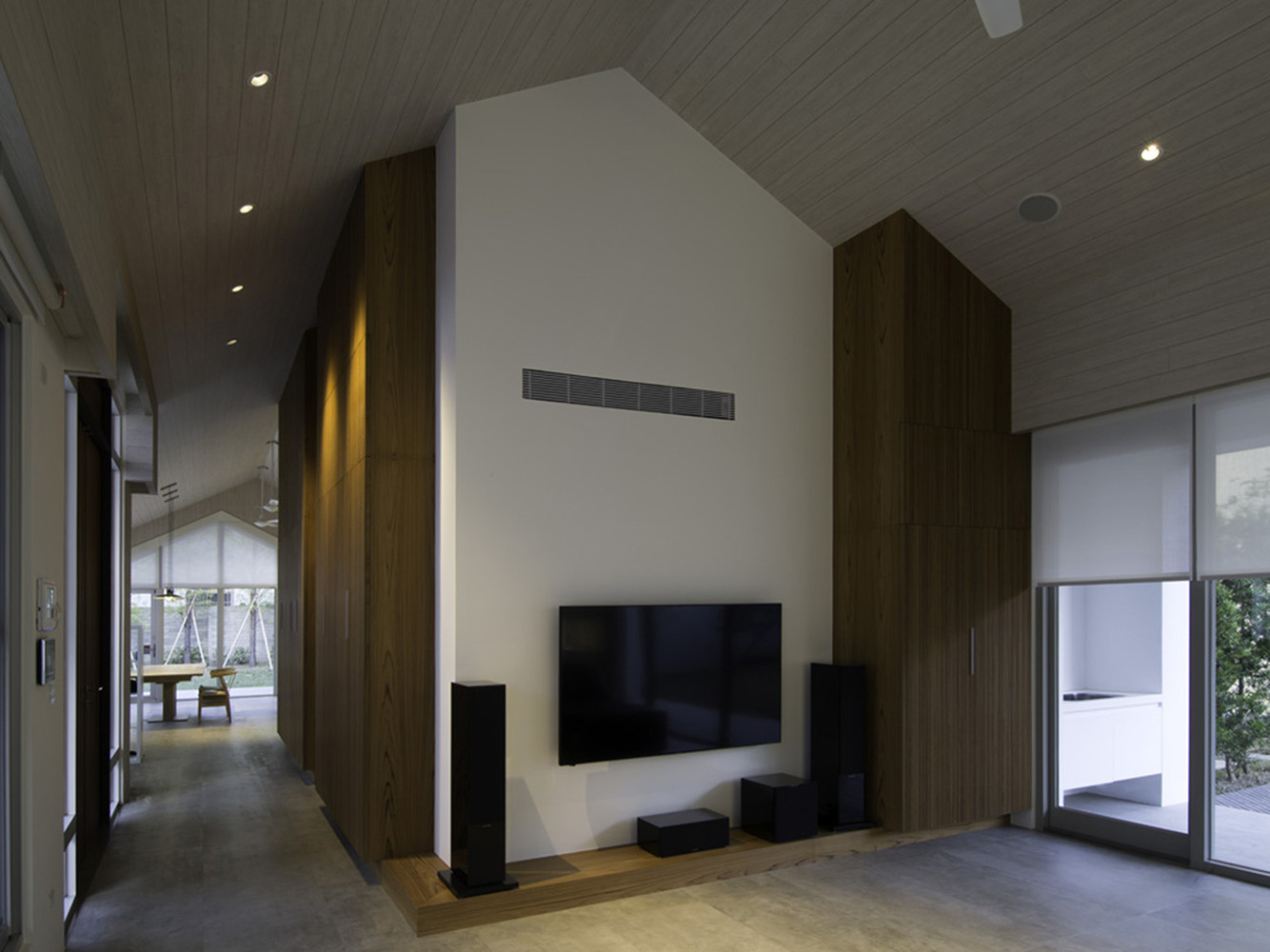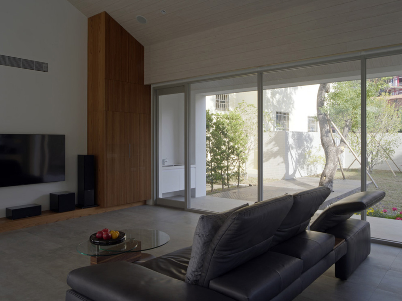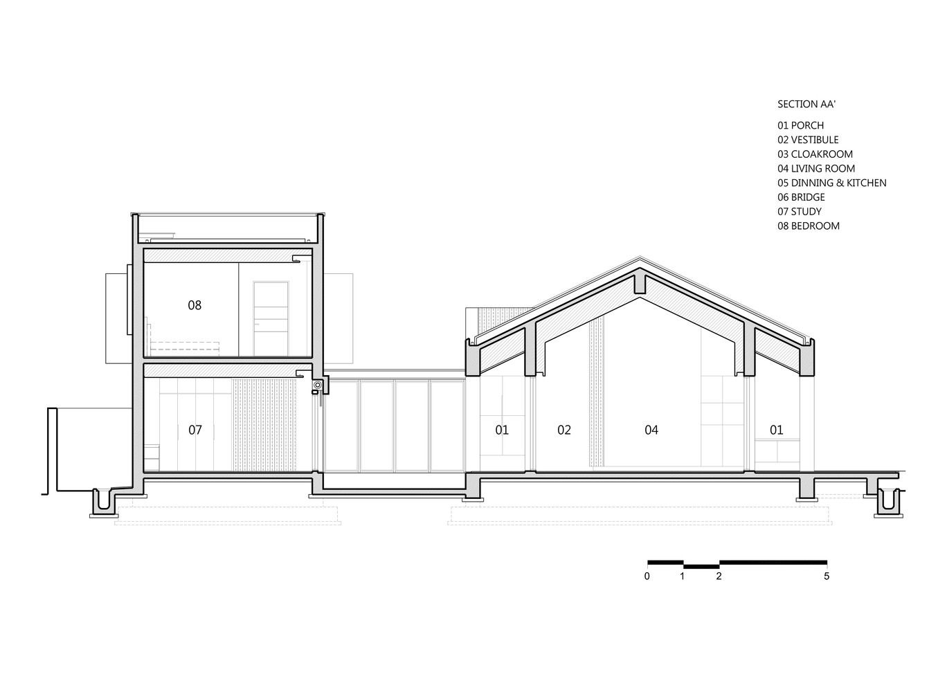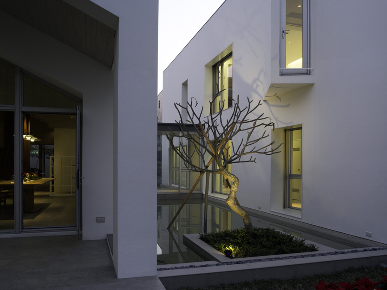 The house is constructed of reinforced concrete frame system, we separate the frame and wall to create a semi-outdoor porch, which benefit the living room with good shading. The pitch-roof canopy turns the chunky volume into a pavilion in the woods. The walls are all painted white, so the daylight and shadow can give the east-and-west facing sculptural walls a dynamic expression. The roof is covered by standing-seam titanium zinc panels, which blends into the neighboring roofscapes.