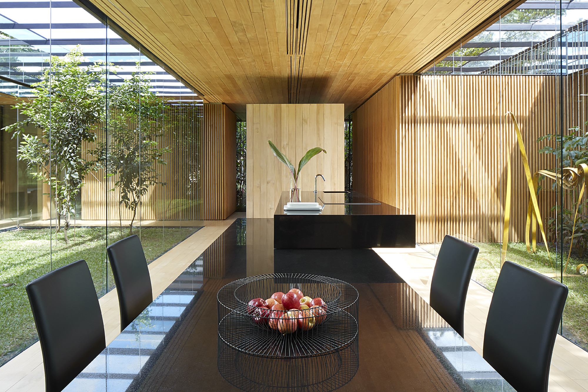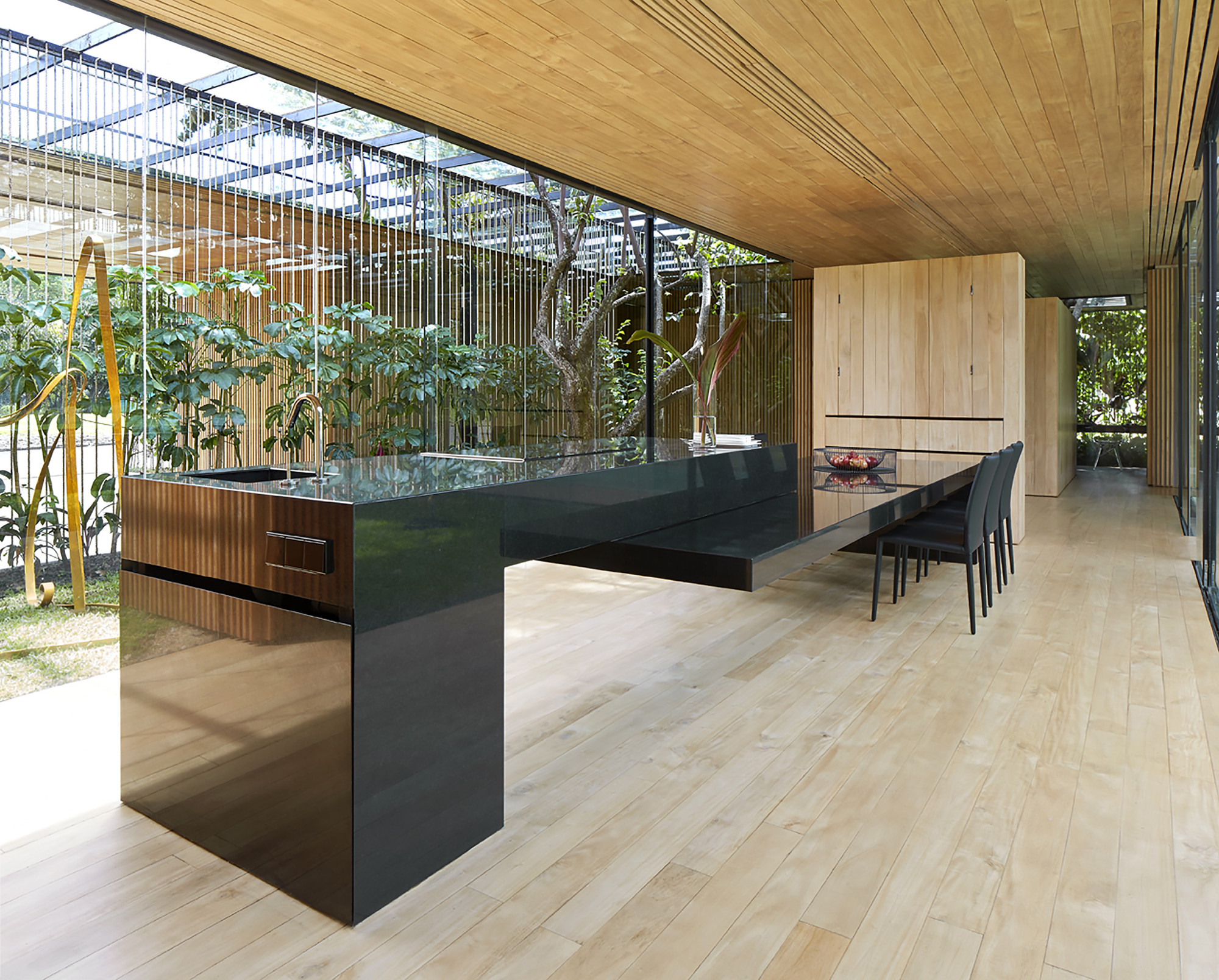 The kitchen table and the kitchen itself shapes a sculptural floor that presides over the social zone. The black gloss of the Absolute Black granite dematerializes, through its reflections, the gesture of formal forcefulness.