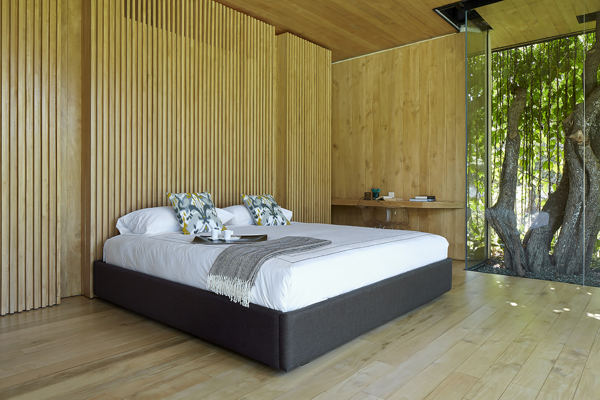 Existing trees remain, uncompromisingly piercing the spaces they occupy.