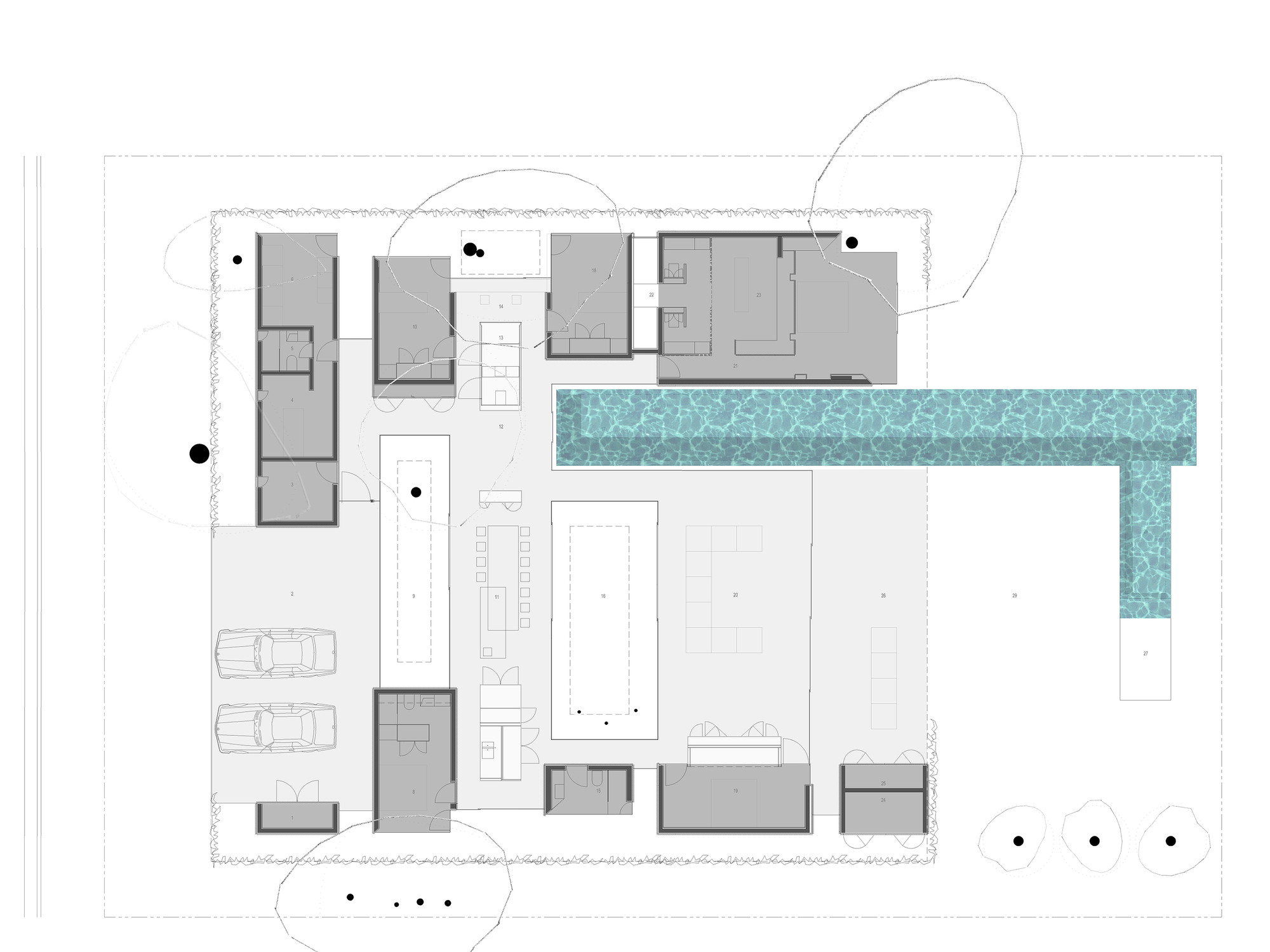 This house responds to the existing features of the landscape and reveals new dimensions of the topography of place. In its formalization and materiality, the experience of light, shadow, earth, water and air is intensified. The general form is readily readable and fluid in its articulation of space.
