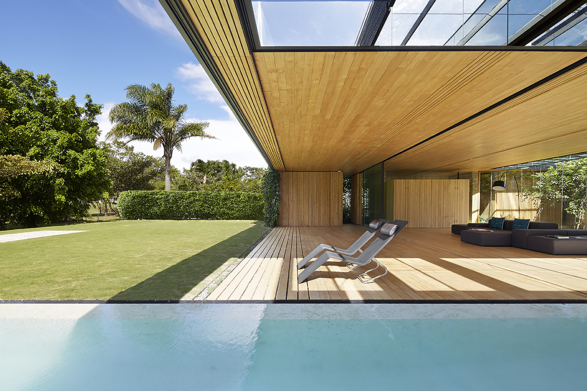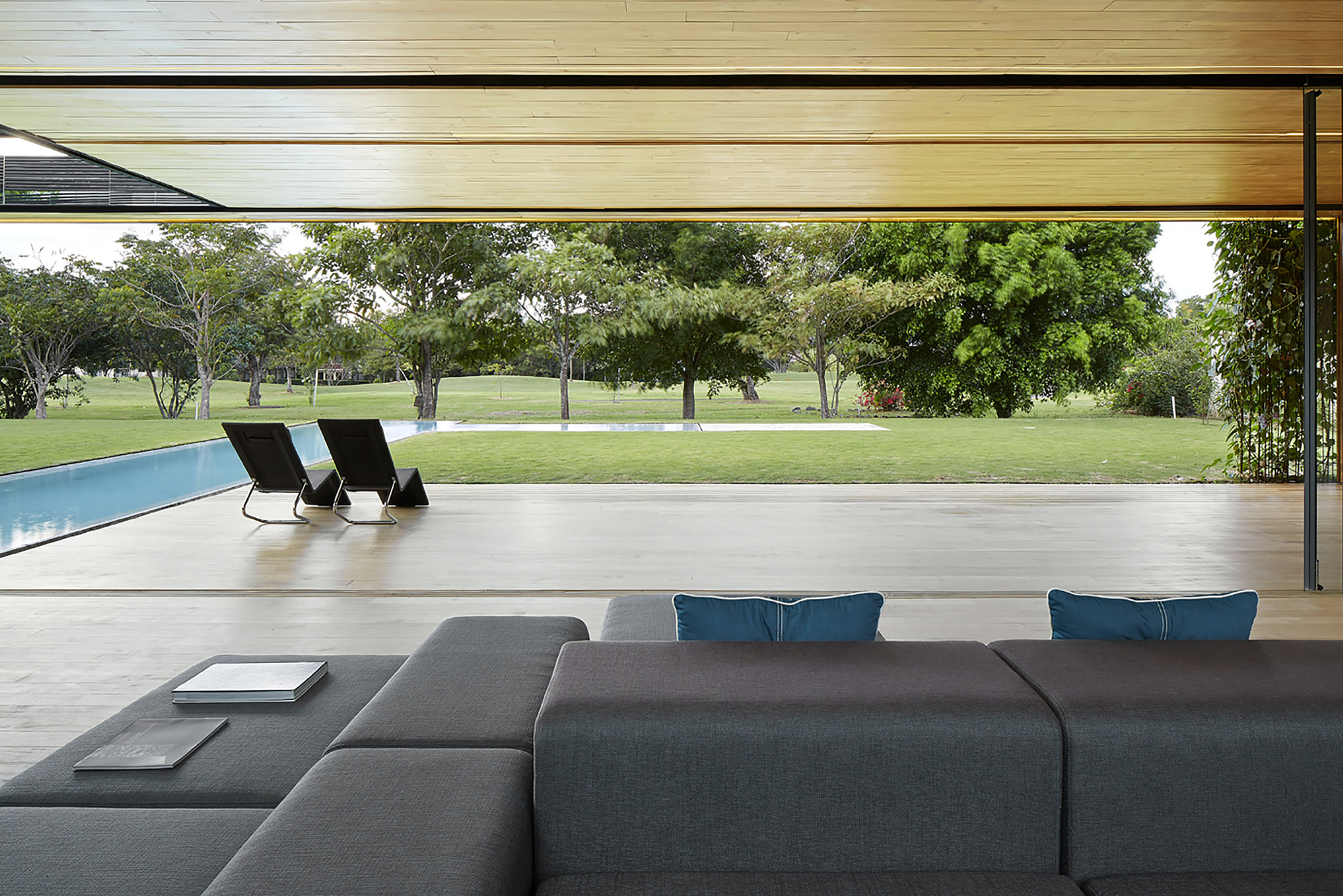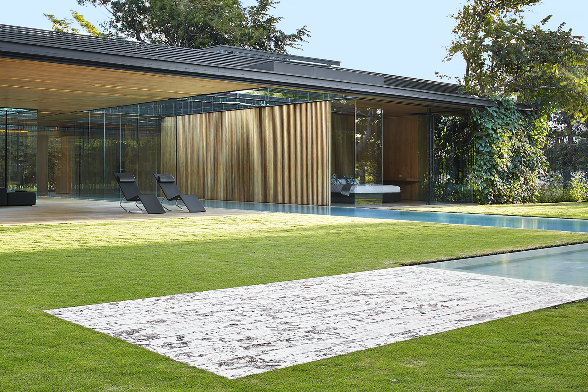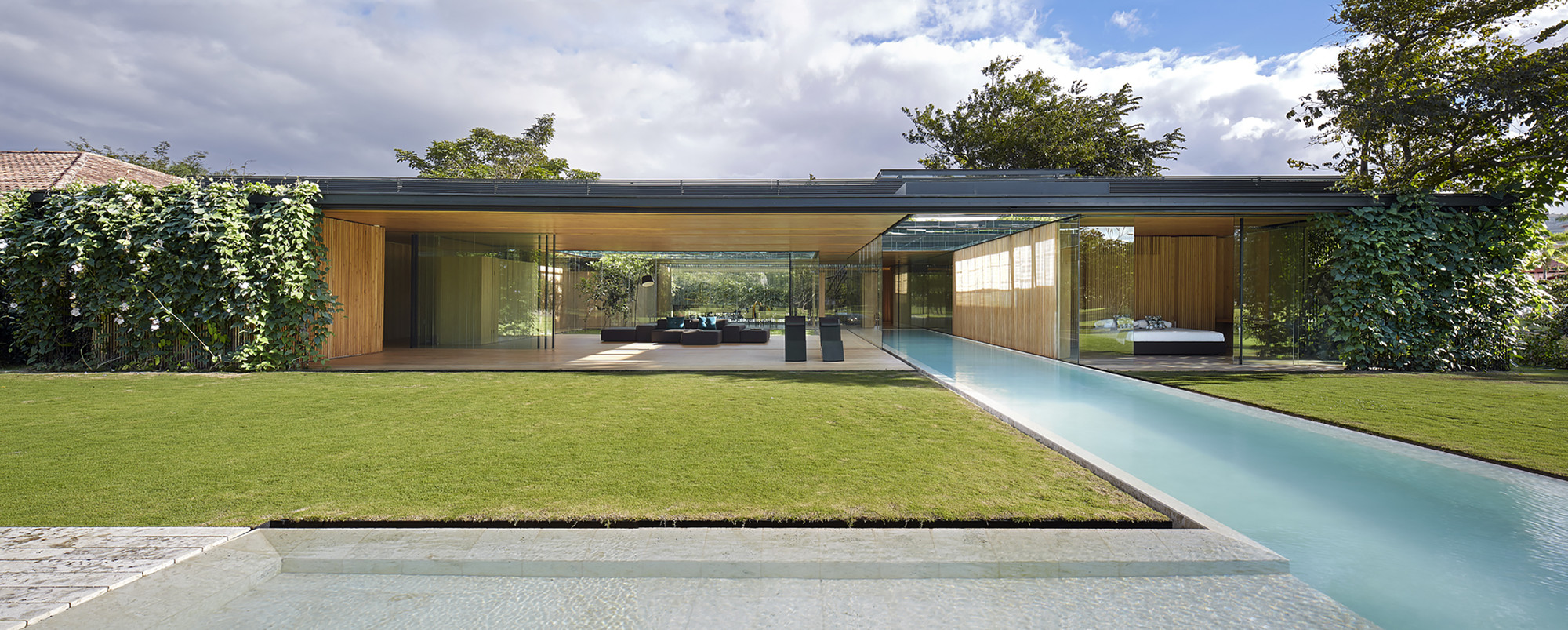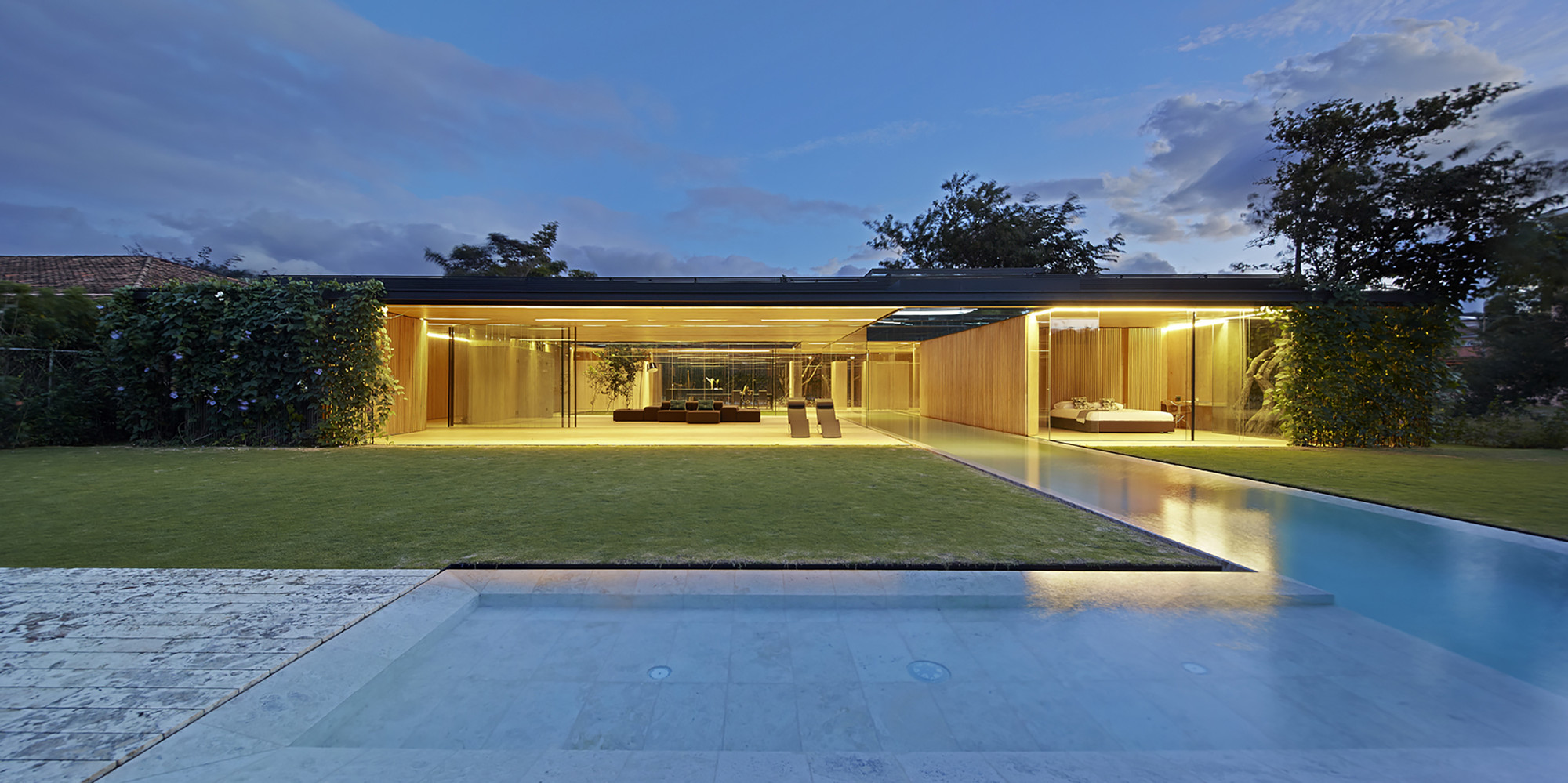 This house establishes an uninterrupted ̈inside-outside ̈ relationship; a sequence of layers between the open and the intermediary. Frontal boundaries are blurred by sheets of glass and vegetation, framed by two horizontal planes, floor and ceiling, where the full and the void are related via a series of matter, water, vegetation and sky. Lateral boundaries establish the ̈full-void ̈ relationship via a series of solid materials that close transversal views.