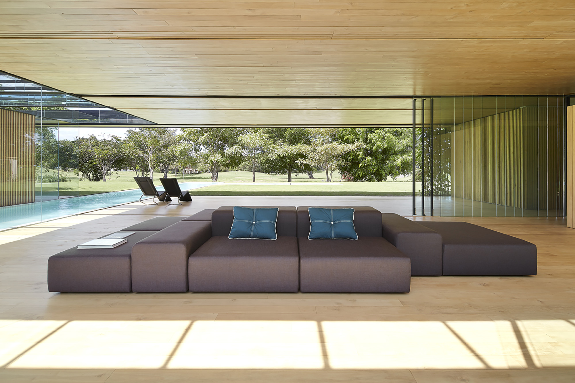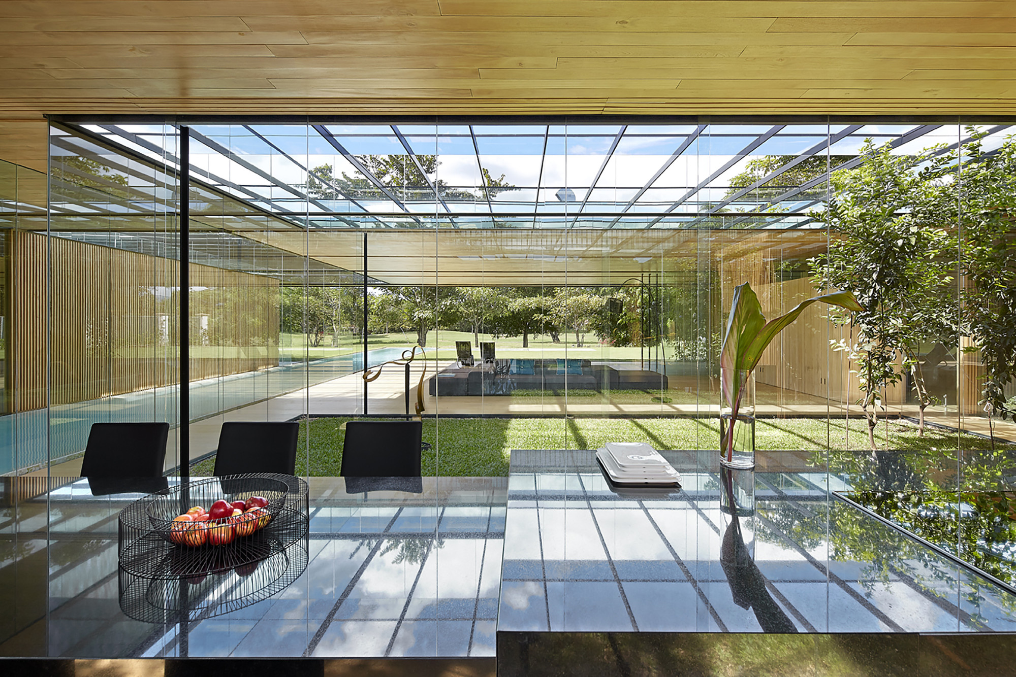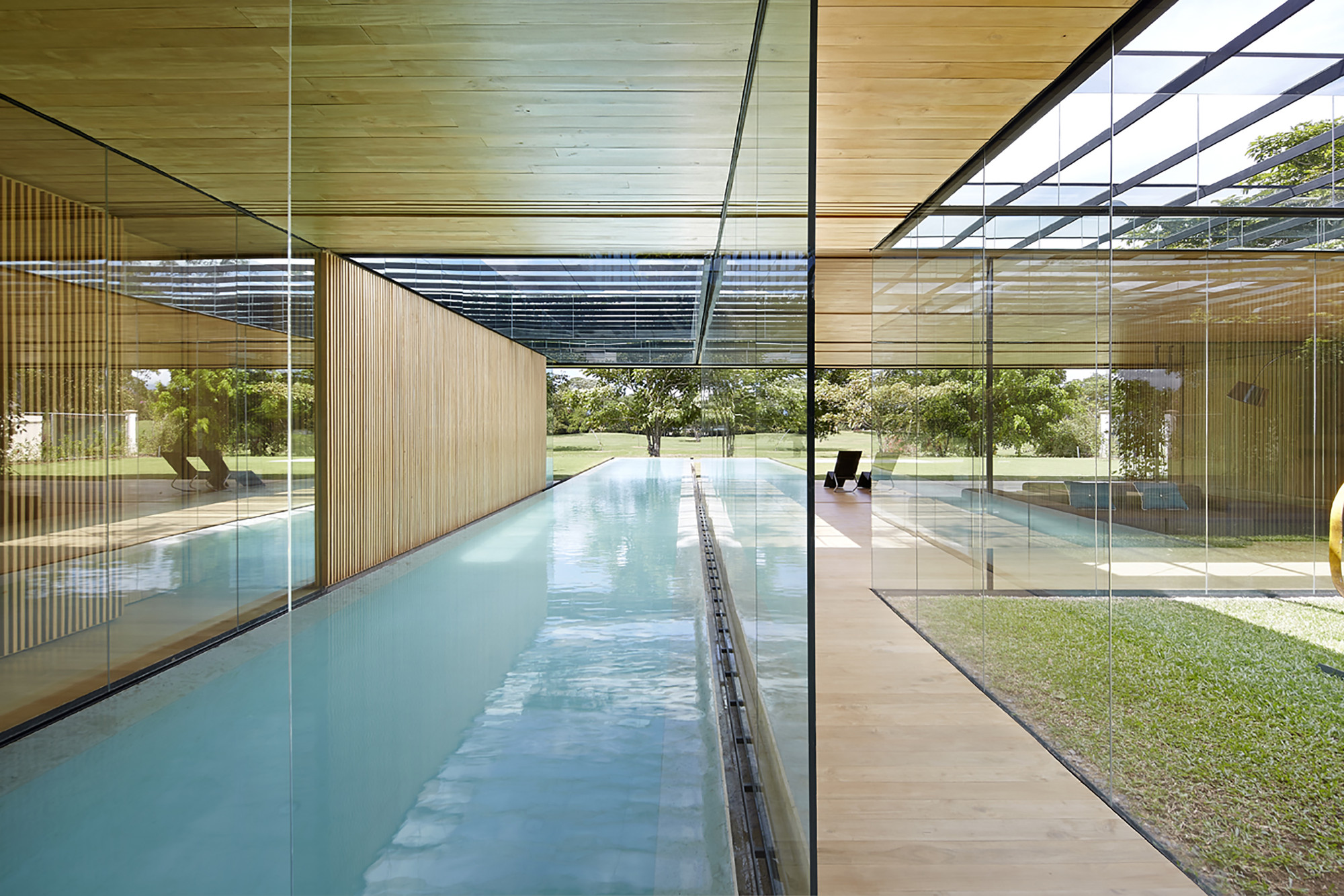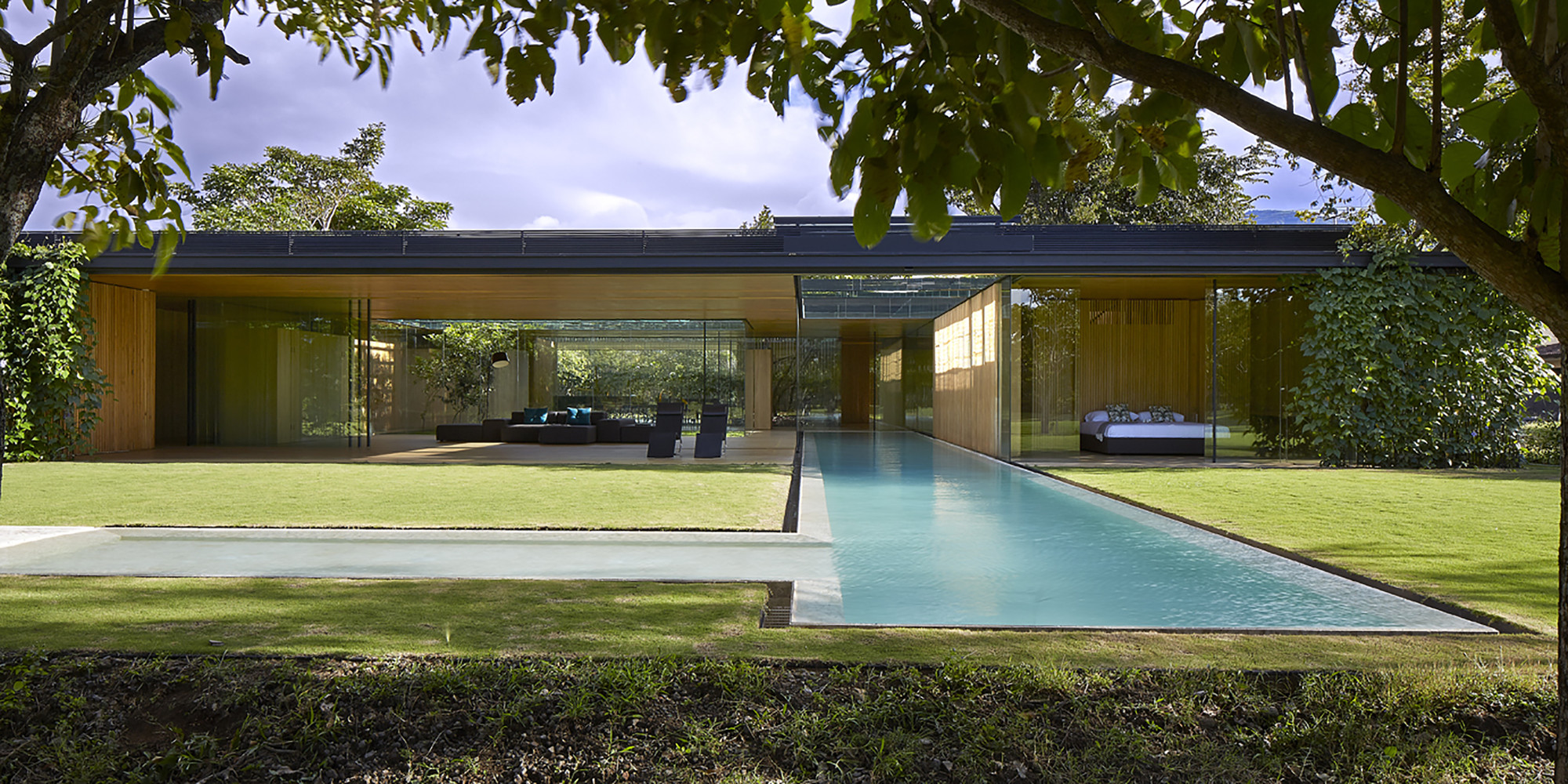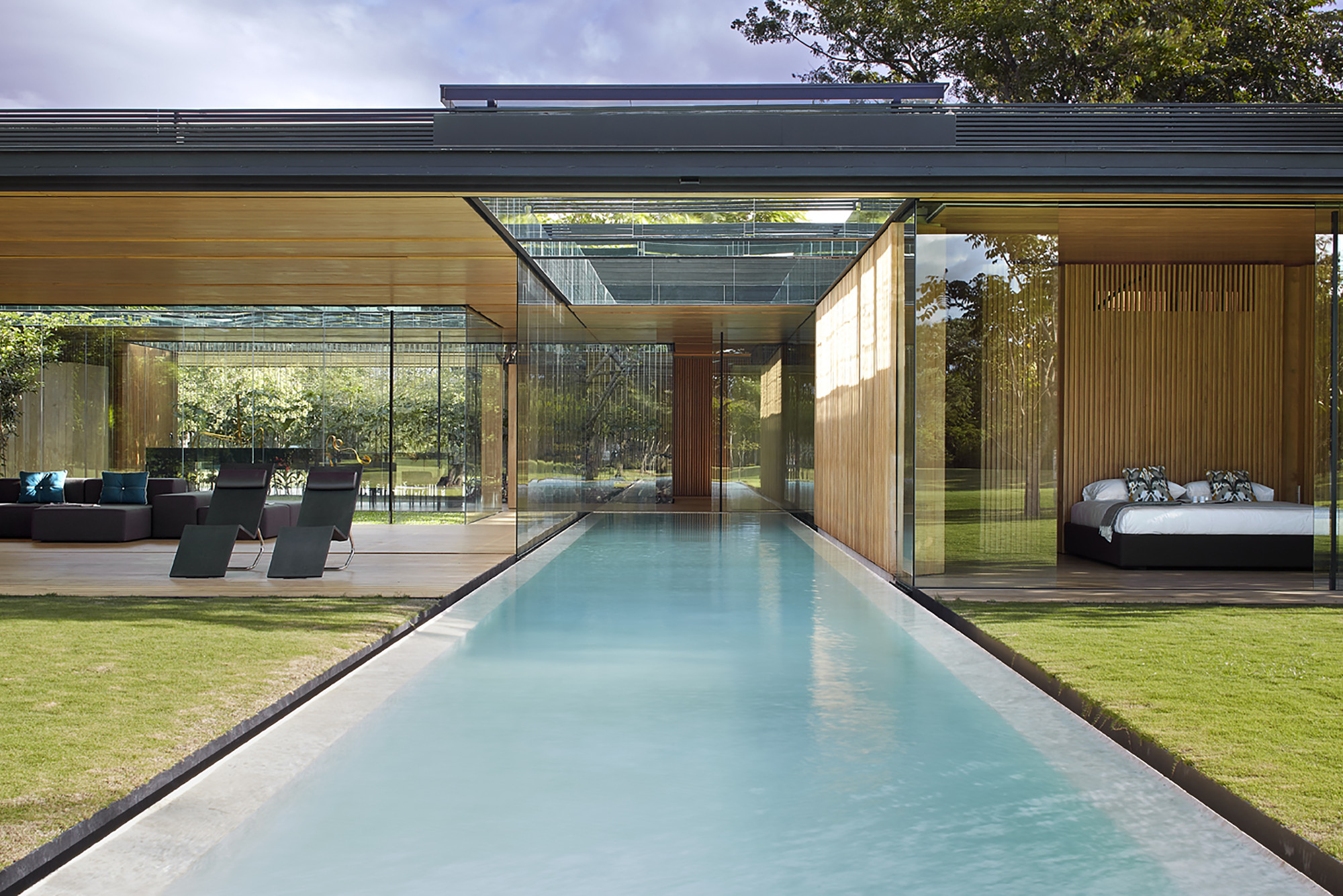 This house establishes an uninterrupted ̈inside-outside ̈ relationship; a sequence of layers between the open and the intermediary. Frontal boundaries are blurred by sheets of glass and vegetation, framed by two horizontal planes, floor and ceiling, where the full and the void are related via a series of matter, water, vegetation and sky. Lateral boundaries establish the ̈full-void ̈ relationship via a series of solid materials that close transversal views.