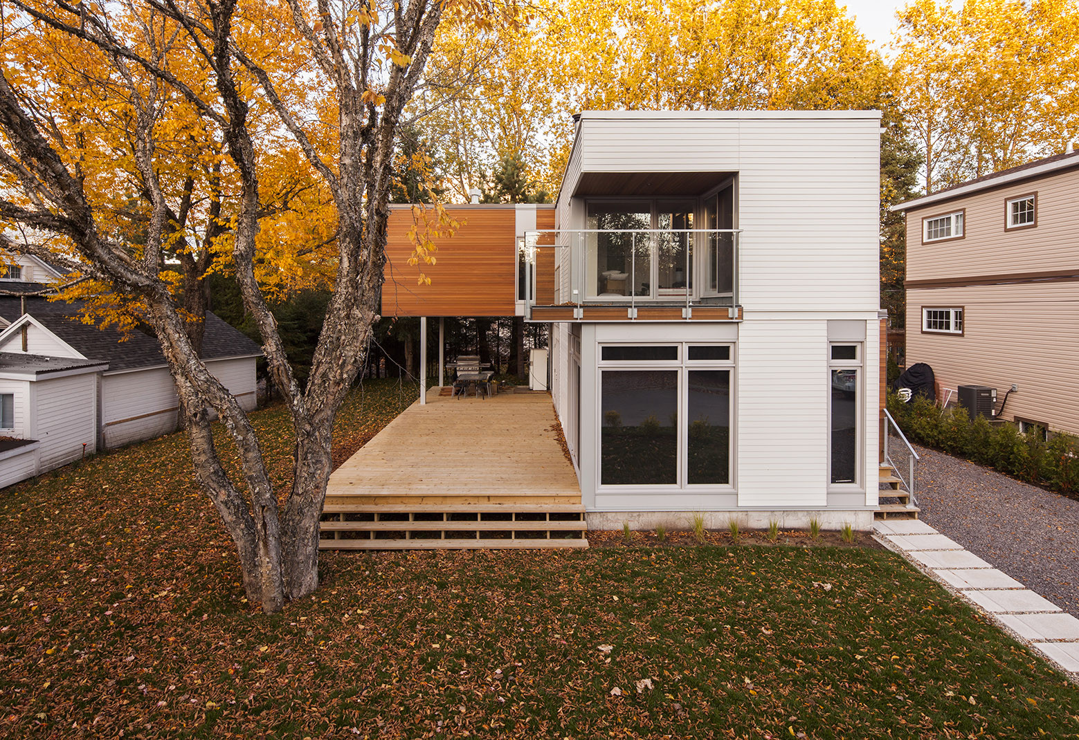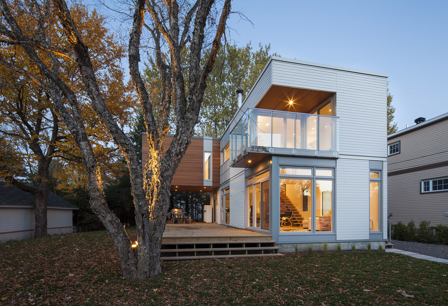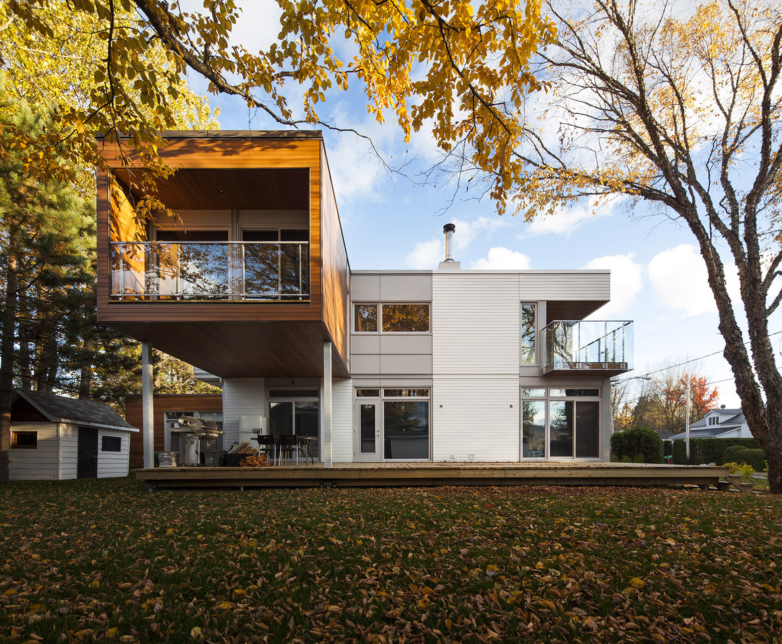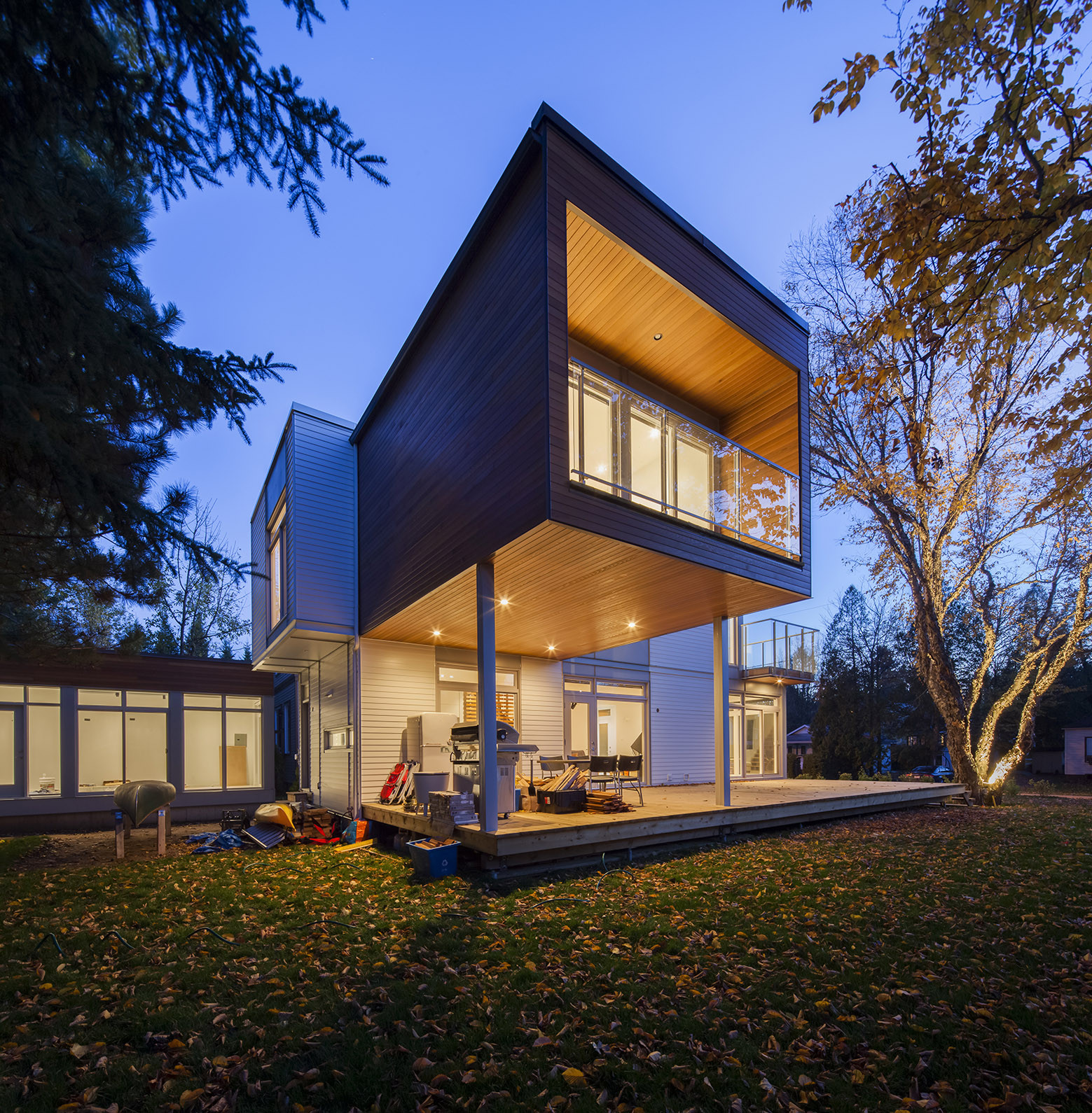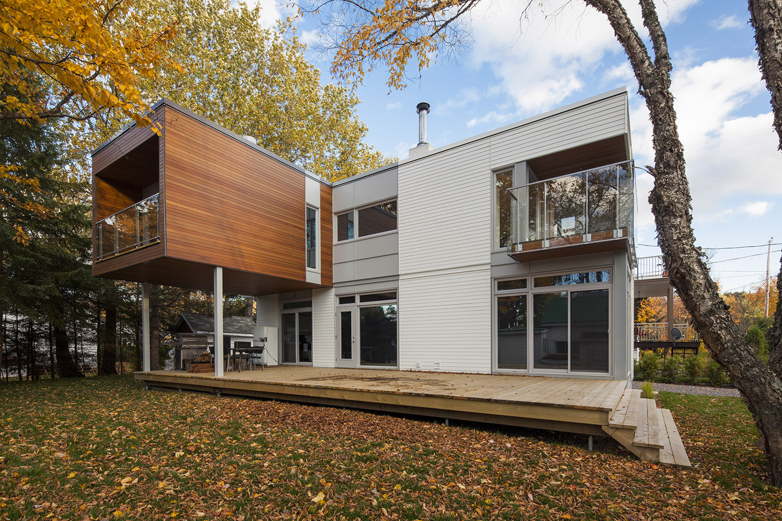 The master bedroom and its balcony projection overlook a section of the patio which spreads along the residence, defining two living spaces according to the needs. The guesthouse offers a lighten rest area. The architectural concept is defined by a contemporary reinterpretation of the vernacular architecture of Quebec’s summer cottages, especially neighboring houses.
