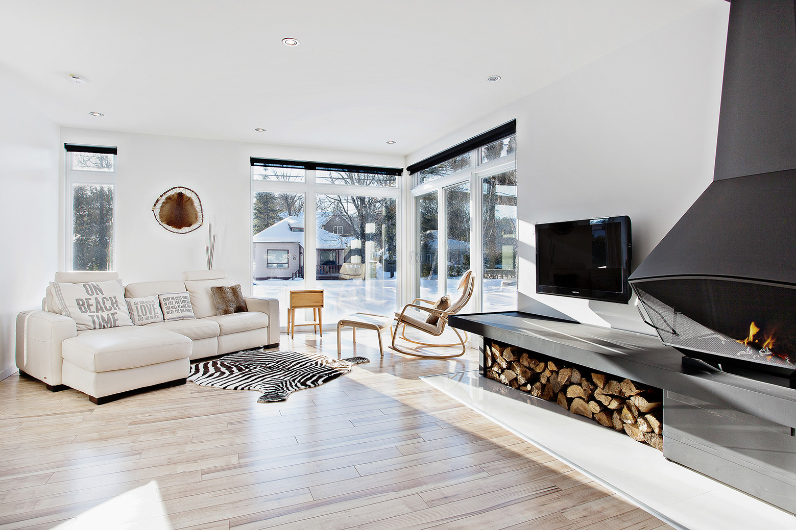 The first level includes the main living area, which is flooded with natural light throughout the day, while the second floor incorporates a washroom, a library, the bedrooms and a pair of balconies that provide exceptional views of Lake St.Joseph. The master bedroom, which happens to be the most comfortable room in the house, also benefits from views of an outdoor deck.