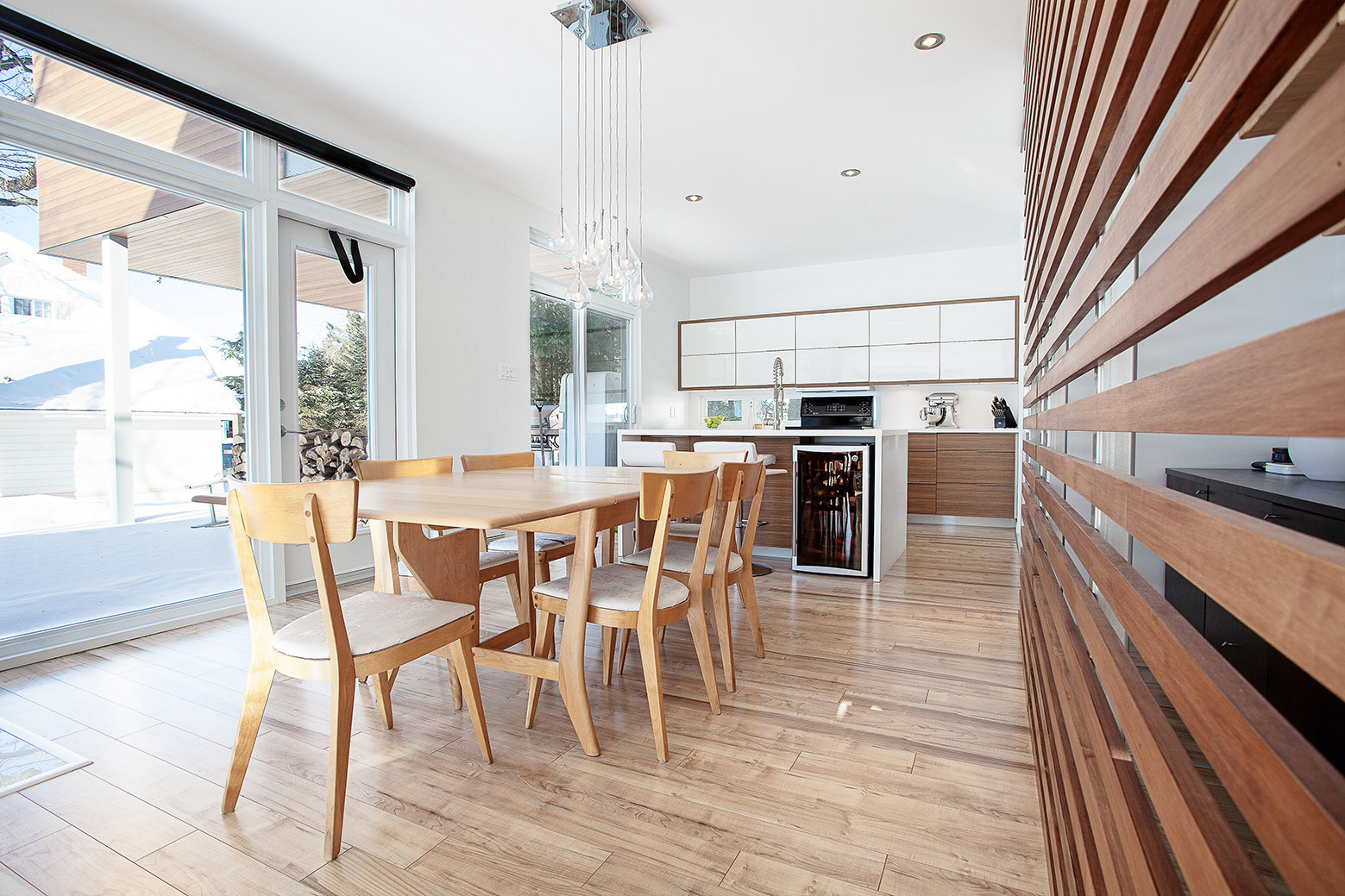The fragmentation of the main volume, in projection and recessed, maximizes interior and exterior living spaces while minimizing the building’s presence on the site. The construction made of prefabricated parts help to reduce disturbances and construction site pollutants, while providing to the residence a quality of construction above standards. The material selection has been done to assure the integration of the contemporary L-House to the natural environment and to the neighboring houses.