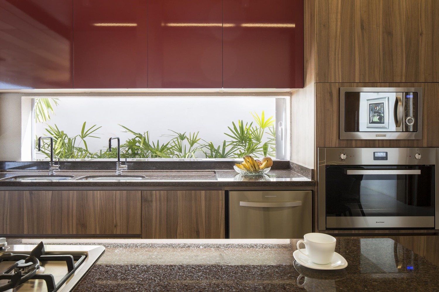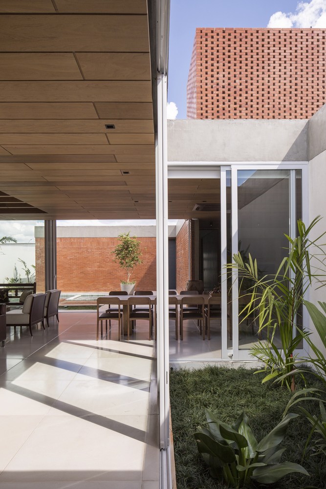 The social spaces such as the living room, dining area and kitchen are all a part of a single continuous space that is defined by a central garden. The architects replaced the bricks in the central hall with large glass bricks that welcome natural light while offering small glimpses of the courtyard. In the social areas, the natural wood cladding in Tonka bean comprises the air conditioning systems as well as the lighting facilities for the dining table and circulation spaces.
